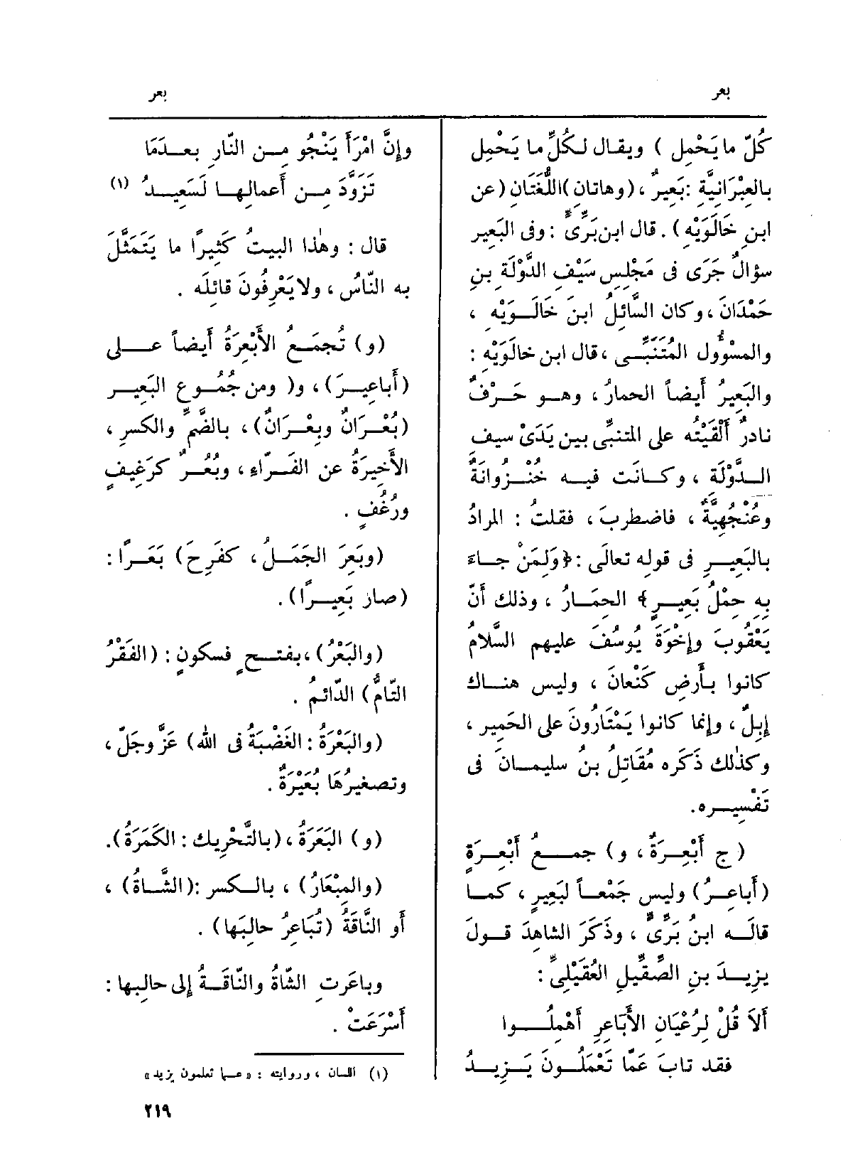كُلّ مَا يَحْمِل) وَيُقَال لكُلِّ مَا يَحْمِل بالعِبْرَانِيَّةِ: بعِيرٌ، (وهاتانِ) اللُّغَتَانِ (عَن ابنِ خَالَوَيْهِ) . قَالَ ابْن بَرِّيٌّ: وَفِي البَعِير سؤالٌ جَرَى فِي مَجْلِسِ سَيْفِ الدَّوْلَةِ بنِ حَمْدَانَ، وَكَانَ السَّائِلُ ابنَ خَالَوَيْهِ، والمسْؤُول المُتَنَبِّي، قَالَ ابْن خالَوَيْهِ: والبَعِيرُ أَيضاً الحمارُ، وَهُوَ حَرْفٌ نادرٌ أَلْقَيْتُه على المتنبِّي بَين يَدَيْ سيفِ الدَّوْلَةِ، وكانَت فِيهِ خُنْزُوانَةٌ وعُنْجُهِيَّةٌ، فاضطربَ، فقلتُ: المرادُ بالبَعِيرِ فِي قولِه تعالَى: {وَلِمَن جَآء بِهِ حِمْلُ بَعِيرٍ} الحِمَارُ، وَذَلِكَ أَنّ يَعْقُوبَ وإِخْوَةَ يُوسُفَ عَلَيْهِم السَّلامُ كَانُوا بأَرضِ كَنْعانَ، وَلَيْسَ هُنَاكَ إِبِلٌ، وإِنما كَانُوا يَمْتَارُونَ على الحَمِير، وكذالك ذَكَره مُقَاتِل بنُ سليمانَ فِي تَفْسِيره.