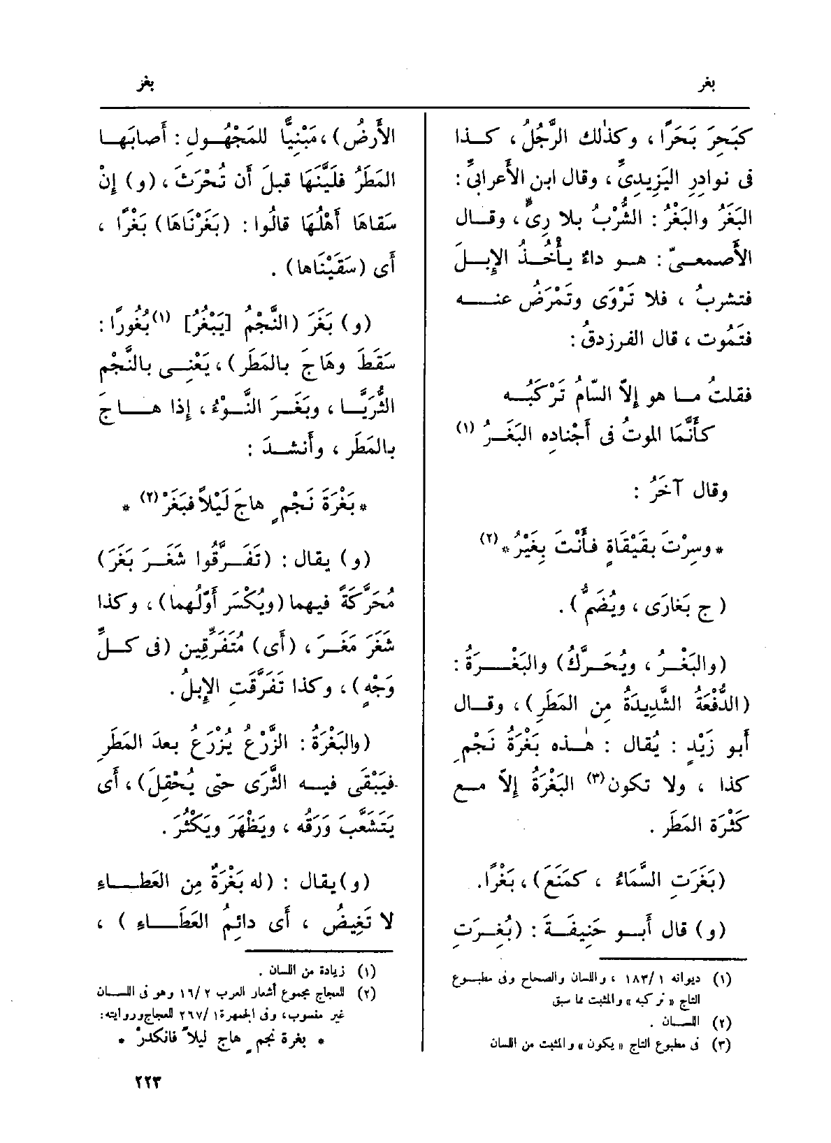 (و) بَغَرَ (النَّجْمُ (يَبْغُرُ) بُغُوراً: سَقَطَ وهَاجَ بالمَطَر) ، يَعْنِي بالنَّجْم الثُّرَيَّا، وبَغَرَ النَّوْءُ، إِذا هاجَ بالمَطَر، وأَنشدَ: