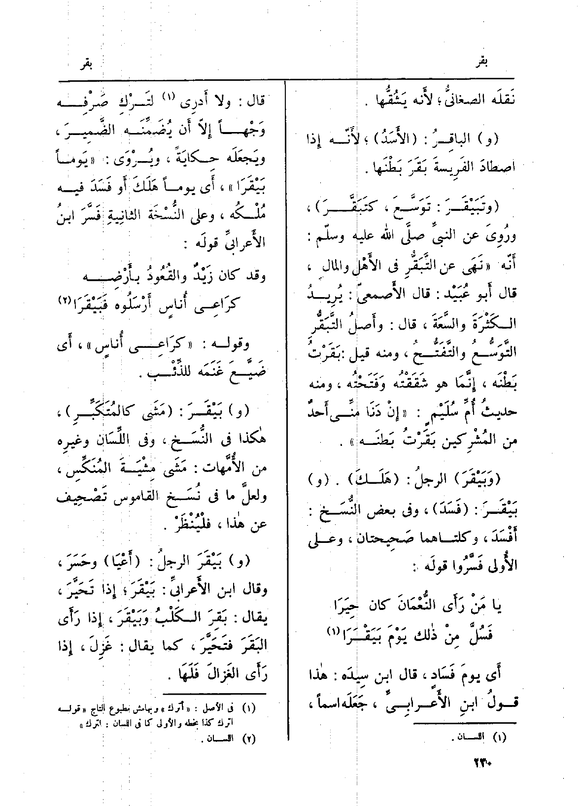 (وتَبَيْقَرَ تَوَسَّعَ، كتَبَقَّرَ) ، ورُوِيَ عَن النبيِّ صلَّى اللهُ عليْه وسلّم: أَنّه (نَهَى عَن التَّبَقُّرِ فِي الأَهْل والمالِ، قَالَ أَبو عُبَيْد قَالَ الأَصمعيّ: يُرِيدُ الكَثْرَةَ والسَّعةَ، قَالَ: وأَصلُ التَّبَقُّرِ التَّوَسُّعُ والتَّفَتُّحُ، وَمِنْه قيل: بَقَرْتُ بَطْنَه، إِنَّمَا هُوَ شَقَقْتُ وَفَتَحْتُه، وَمِنْه حديثُ أُمِّ سُلَيْمٍ: (إِنْ دَنَا منِّي أَحدٌ من المُشْرِكين بَقَرْتُ بَطنَه) .