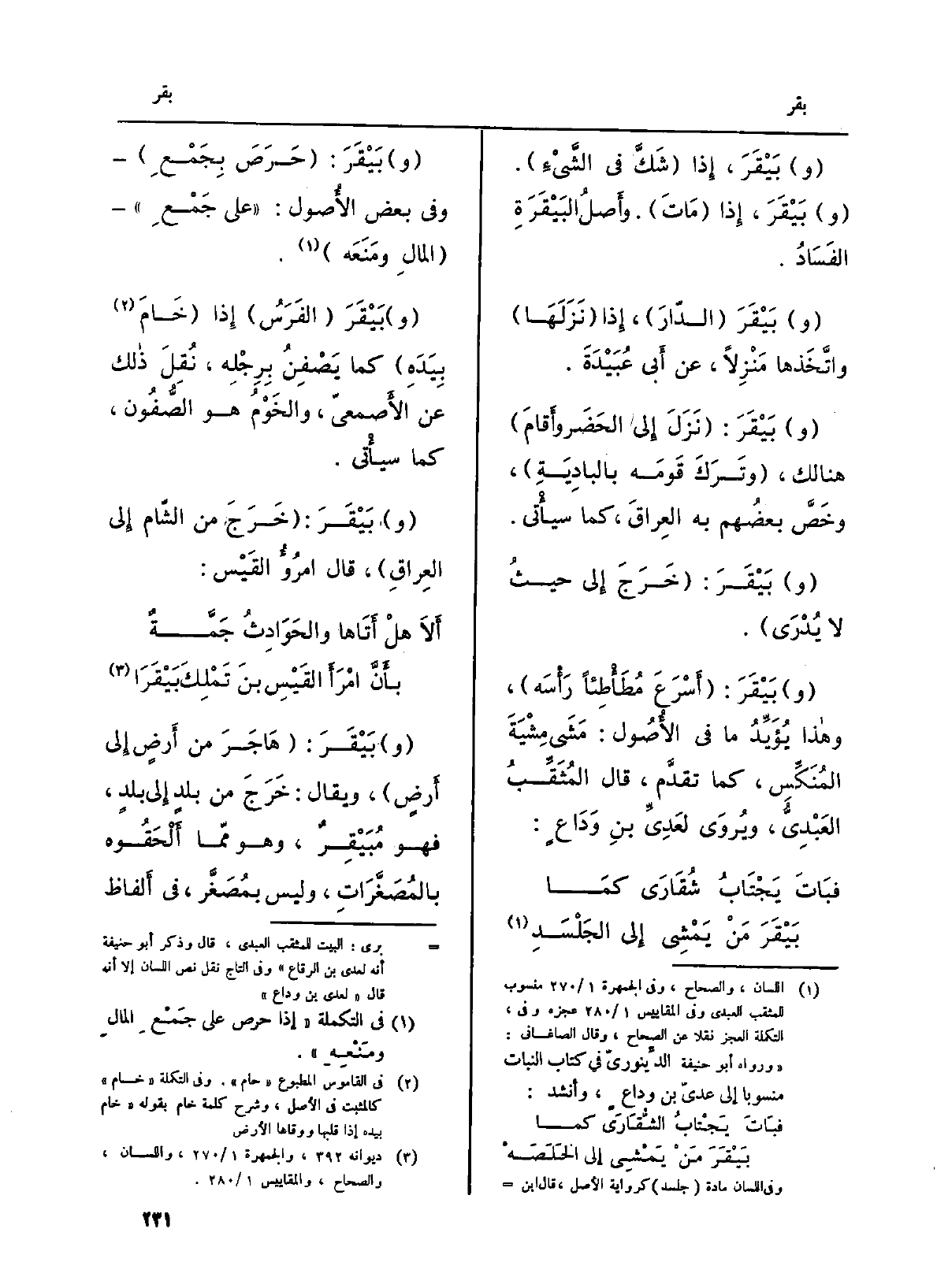 (و) بَيْقَرَ، إِذا (شَكَّ فِي الشَّيْءِ) . (و) بَيْقَرَ، إِذا (مَاتَ) . وأَصلُ البَيْقَرَةِ الفَسَادُ.