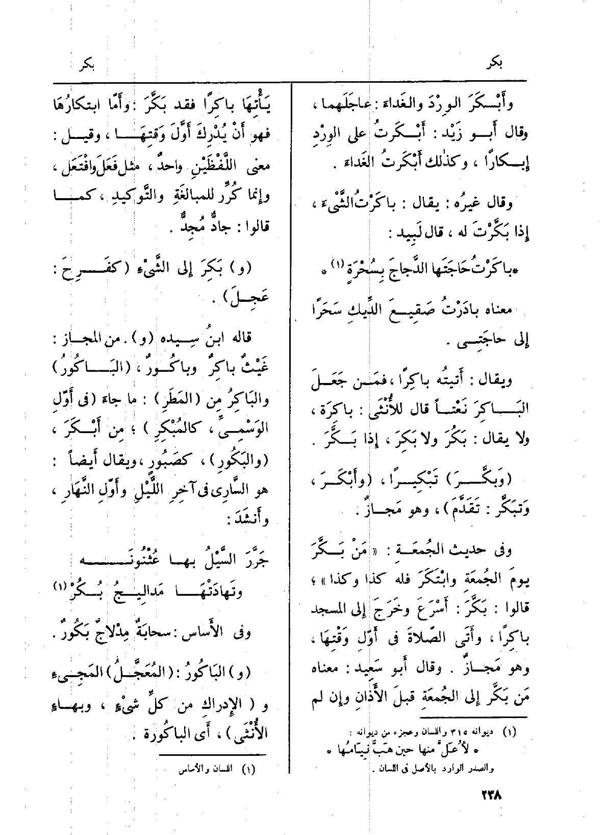 (و) بَكِرَ إِلى الشَّيْءِ (كفَرِحَ: عَجِلَ) .