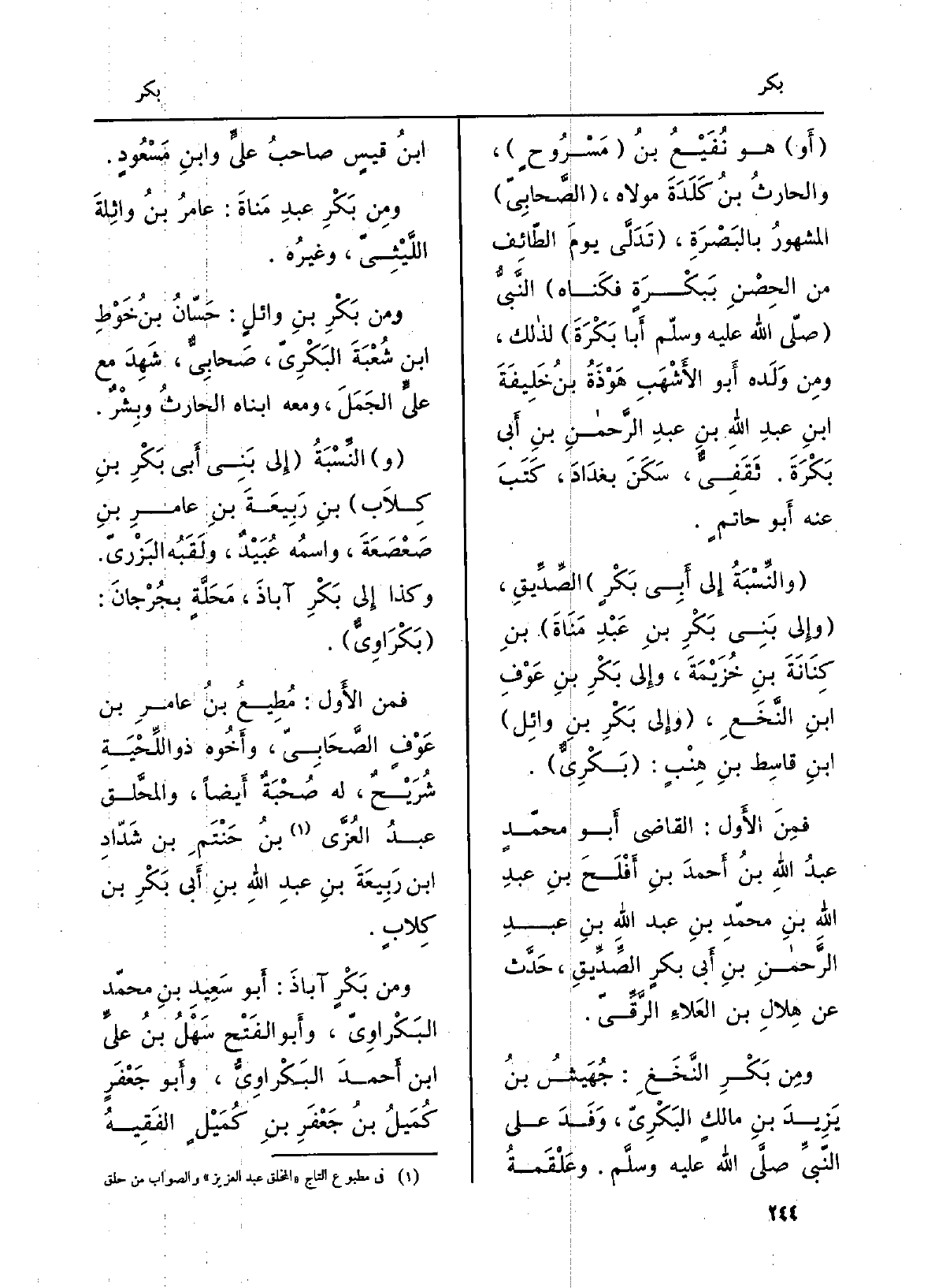 وَمن بَكْرٍ آباذَ: أَبو سَعِيدِ بنِ محمّد البَكْراوِيّ، وأَبو الفَتْح سَهْلُ بنُ عليِّ بن أَحمدَ البَكْراوِيُّ، وأَبو جَعْفَرٍ كُمَيلُ بنُ جَعْفَرِ بنِ كُمَيْلٍ الفَقِيهُ