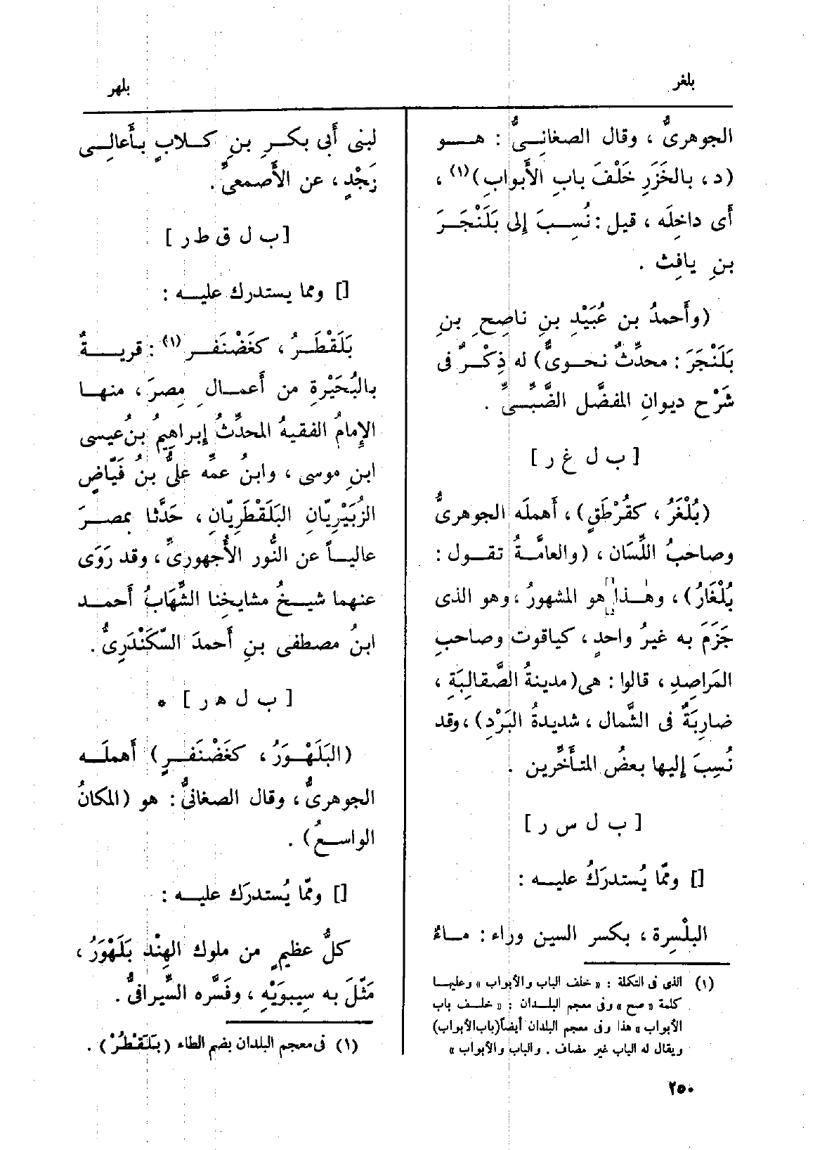 الجوهريُّ، وَقَالَ الصغانِيُّ: هُوَ (د، بالخَزَرِ خَلْفَ بابِ الأَبوابِ) ، أَي داخِلَه، قيل: نُسِبَ إِلى بَلَنْجَرَ بنِ يافِث.