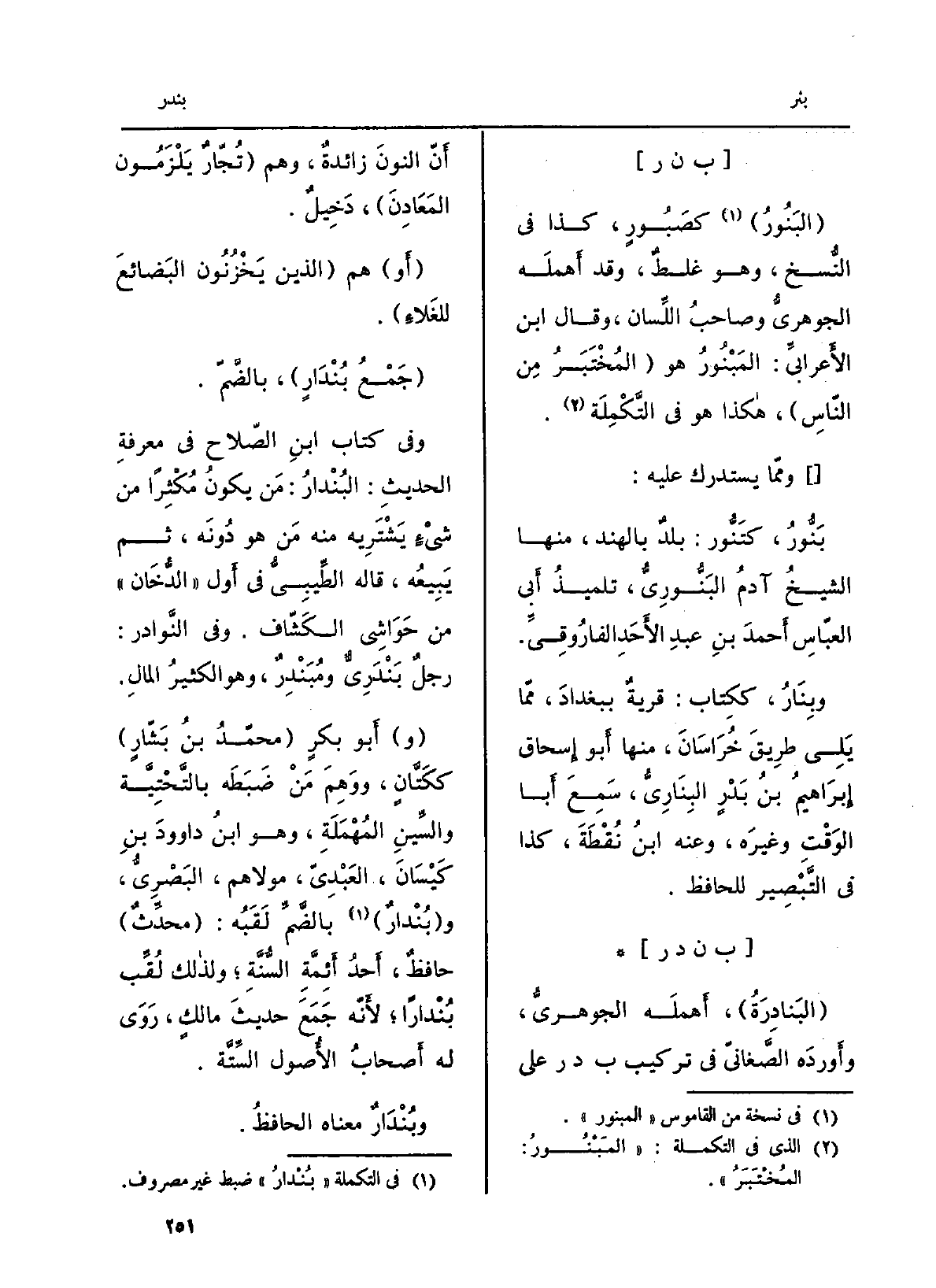 : (البَنادِرَةُ) ، أَهملَه الجوهريُّ، وأَوردَه الصَّغانيّ فِي تركيب ب د ر على أَنّ النونَ زائدةٌ، وهم (تُجّترٌ يَلْزَمُون المَعَادِنَ) ، دَخِيلٌ.