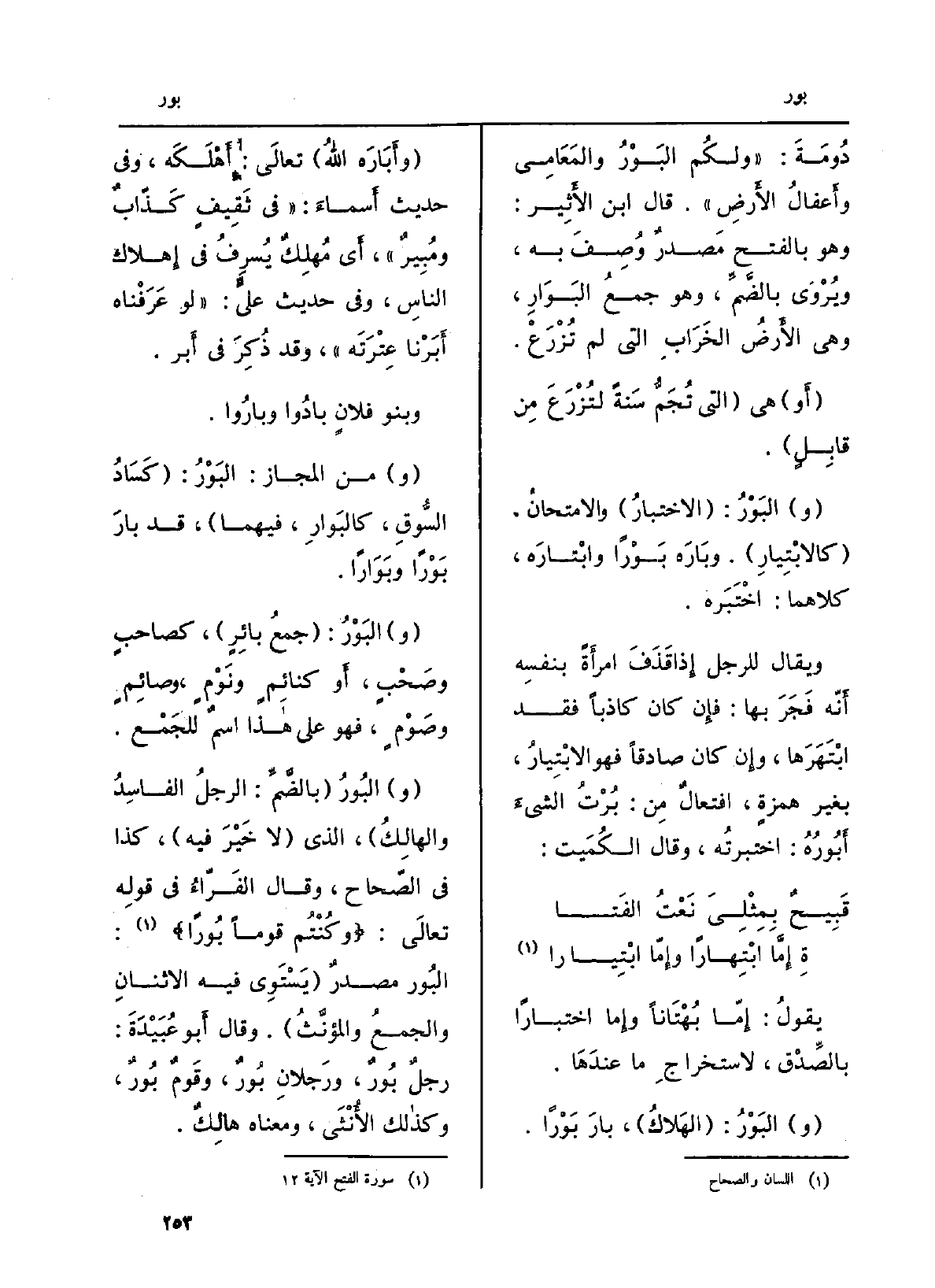 (و) } البُورُ (بالضَّمِّ: الرجلُ الفاسِدُ والهالِكُ) ، الَّذِي (لَا خَيْرَ فِيهِ) ، كَذَا فِي الصّحاح، وَقَالَ الفَرّاءُ فِي قولهِ تعالَى: {وَكُنتُمْ قَوْماً! بُوراً} (الْفَتْح: 12) : البُور مصدرٌ (يَسْتَوِي فِيهِ الإثنانِ والجمعُ والمؤنَّثُ) . وَقَالَ أَبو عُبَيْدَةَ: رجلٌ بُورٌ، ورَجلانِ بُورٌ، وقَومٌ بُورٌ، وكذالك الأُتْثَى، وَمَعْنَاهُ هالِكٌ.