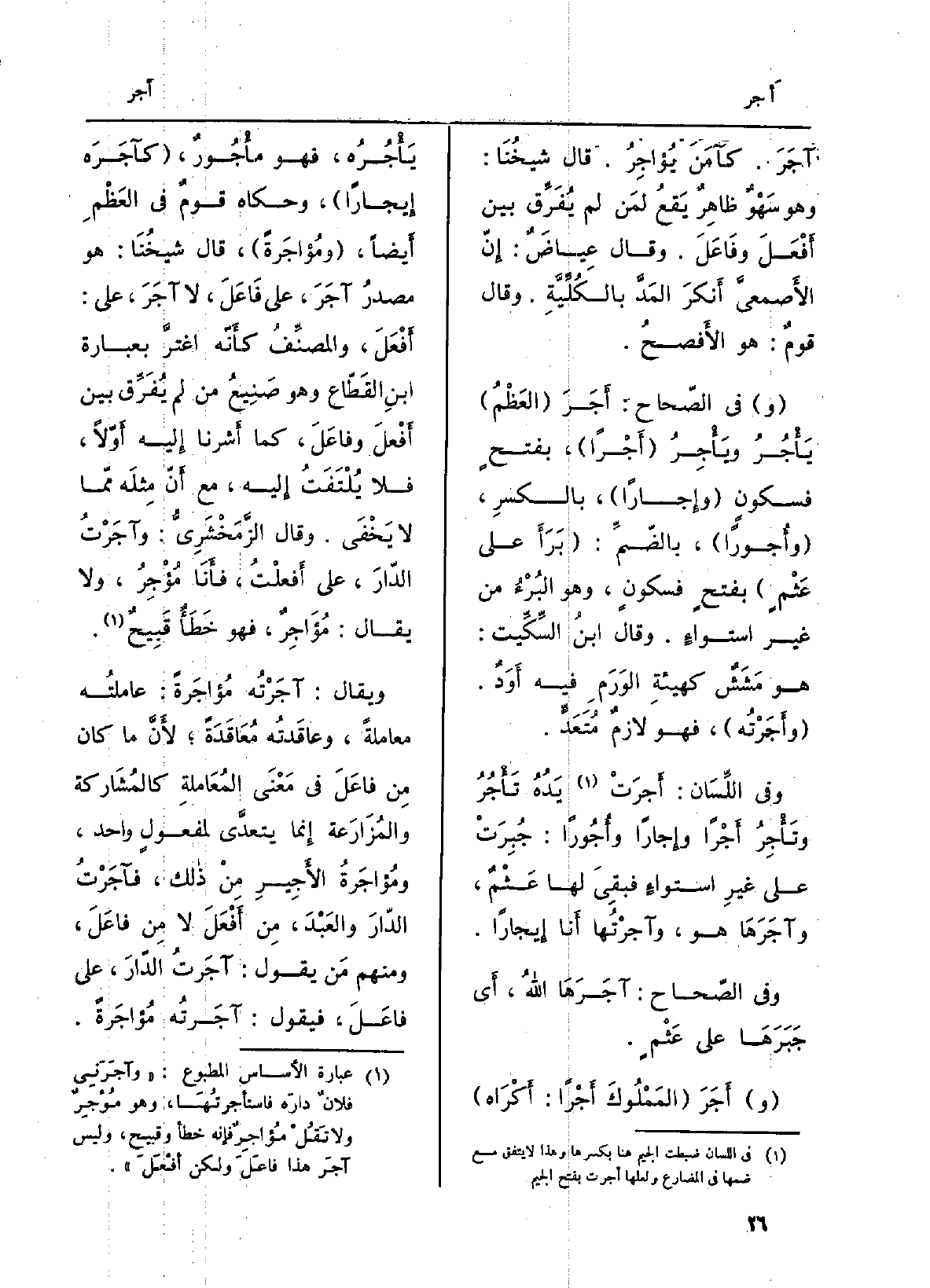 وَيُقَال: {آجَرْتُه} مُؤاجَرةً: عاملتُه معاملً، وعاقَدتُه مُعَاقَدَةً؛ لأَنَّ مَا كَانَ مِن فاعَلَ فِي مَعْنَى المُعَاملةِ كالمُشَاركة والمُزَارَعة إِنما يتعدَّى لمفعولٍ وَاحِد، {ومُؤاجَرةُ} الأَجِيرِ مِنْ ذالك، {فآجَرْتُ الدّارَ والعَبْدَ، مِن أَفْعَلَ لَا مِن فاعَلَ، وَمِنْهُم مَن يَقُول:} آجَرتُ الدّارَ، على فاعَلَ، فَيَقُول: {آجَرتُه} مُؤاجَرةً
