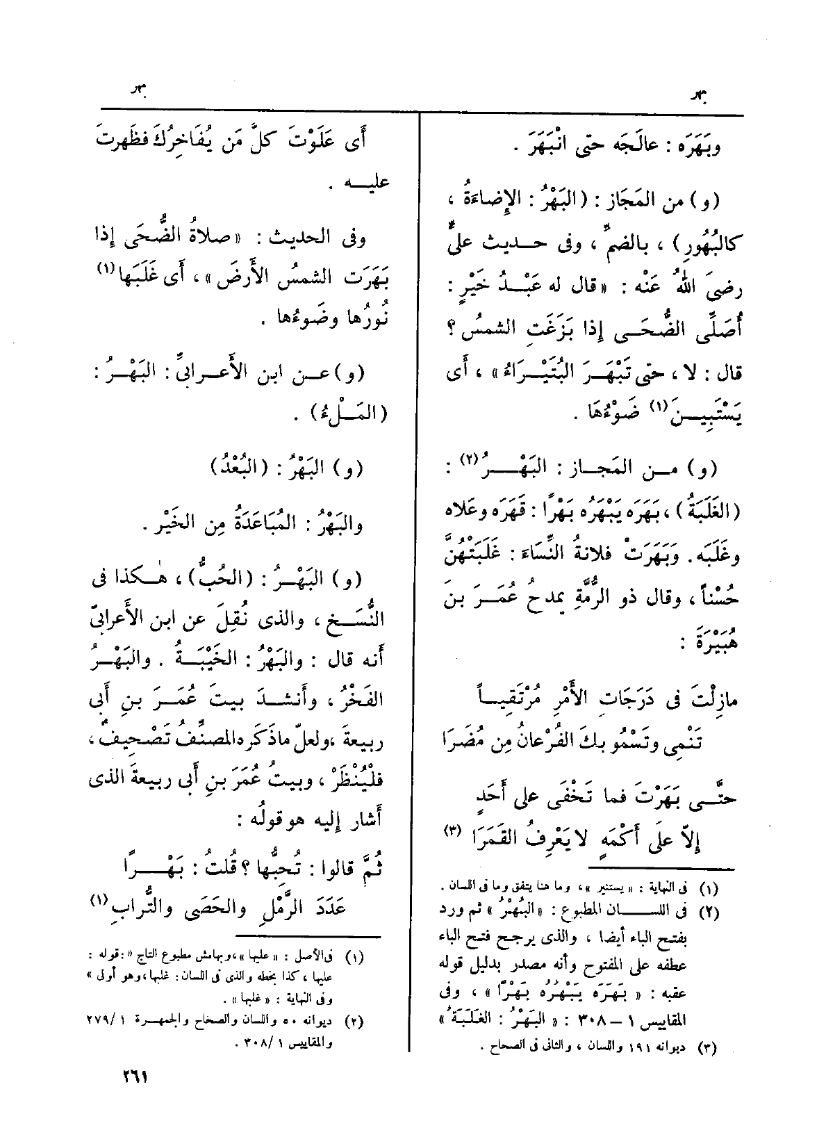 (و) من المَجاز: البَهْرُ: (الغَلَبَةُ) ، بَهَرَه يَبْهَرُ بَهْراً: قَهَرَه وعَلاه وغَلَبَه. وَبَهَرَتْ فلاةُ النِّسَاءَ: غَلَبَتْهُنَّ حُسْناً، وَقَالَ ذُو الرُّمَّةِ يمدحُ عُمَرَ بنَ هُبَيْرَةَ:
