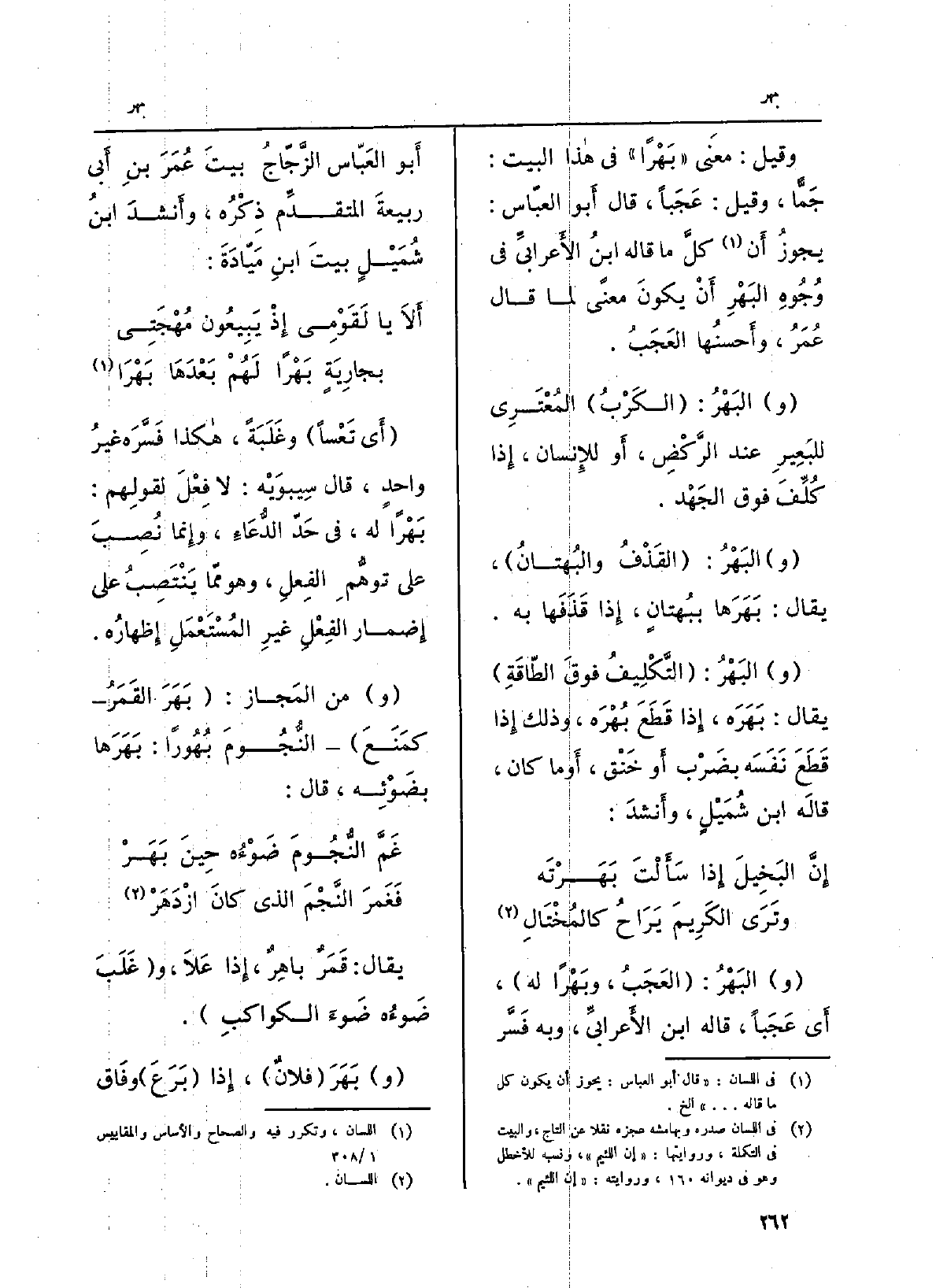 وَقيل: معنَى (بَهْراً) فِي هاذا الْبَيْت: جَمًّا، وَقيل: عَجَباً، قَالَ أَبو العبّاس: يجوزُ أَن كلَّ مَا قَالَه ابنُ الأَعرابيِّ فِي وُجُوهِ البَهْرِ أَنْ يكونَ معنىٌ لما قَالَ عُمَرُ، وأَحسنُها العَجَبُ.