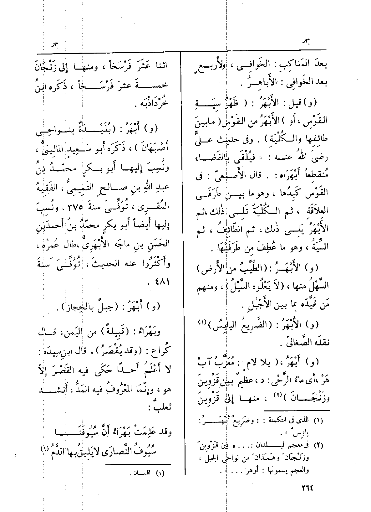 (و) أَبْهَرُ: (بُلَيْدَةٌ بنواحِي أَصْبَهَانَ) ، ذَكَرَه أَبو سَعِيدٍ المالِينيُّ، ونُسِبَ إِليها أَبو بكرٍ محمّدُ بنُ عبدِ اللهِ بنِ صالحٍ التَمِيمِيُّ، الفَقِيهُ المُقرِي، تُوُفِّيَ سنةَ 375 هـ، ونُسِبَ إِليها أَيضاً أَبو بكرٍ محمّدُ بنُ أَحمدَ بنِ الحَسَنِ بنِ ماجَه الأَبْهَرِيُّ، طَال عُمرُه، وأَكْثَرُوا عَنهُ الحديثَ، تُوُفِّيَ سَنةَ 481 هـ.