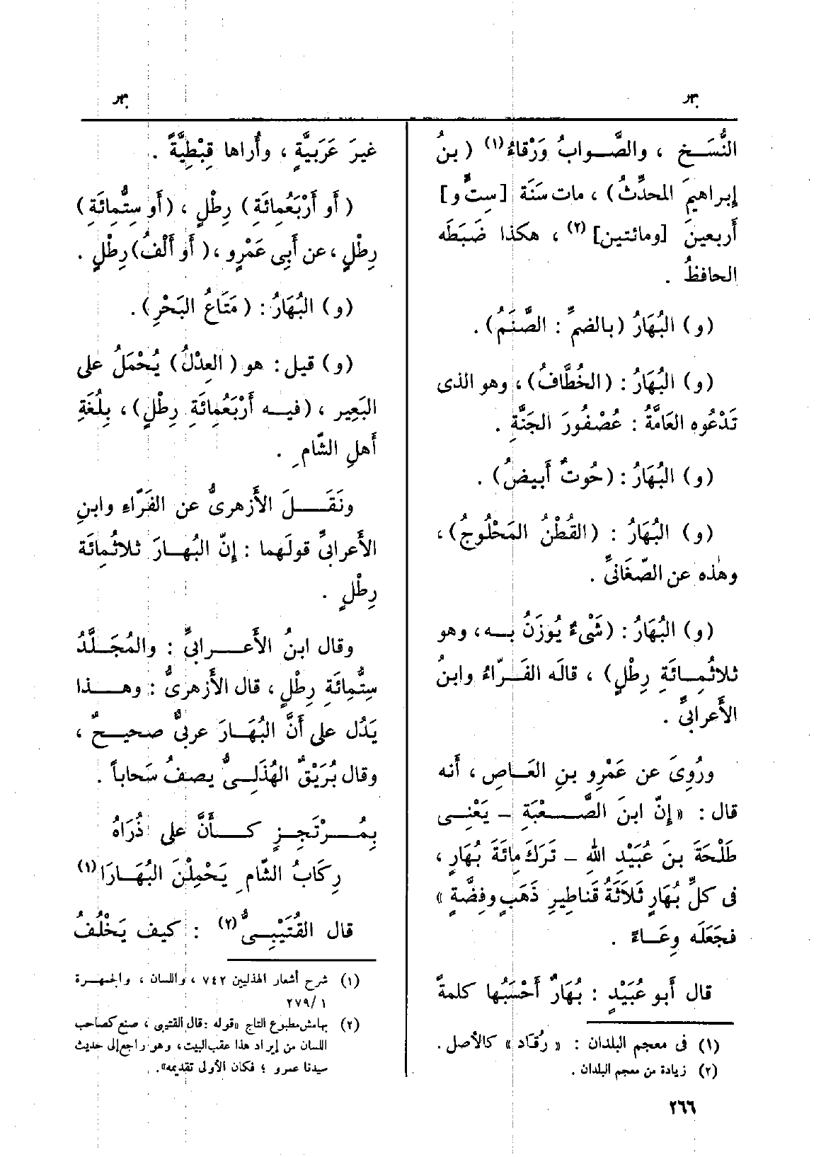 وَقَالَ ابنُ الأَعرابيِّ: والمُجَلَّدُ سِتُّمَائَةِ رِطْلٍ، قَالَ الأَزهريُّ: وهاذا يَدُل على أَنَّ البُهَارَ عربيٌّ صحيحٌ، وَقَالَ بُرَيْقٌ الهُذَلِيُّ يصفُ سَحاباً: