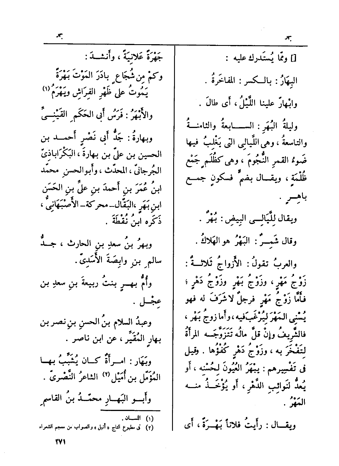 والعربُ تقولُ: الأَزواجُ ثَلاثةٌ: زَوْجُ مَهْرٍ، وزَوْجُ بَهْرٍ وزَوْجُ دَهْرٍ؛ فأَمَّا زَوْجُ مَهْرٍ فرجلٌ لَا شَرَفَ لَهُ فَهُوَ يُسْنِي المَهْرَ لِيُرْغَبَ فِيهِ، وأَما زوجُ بَهْر، فالشَّرِيفُ وإِنْ قلَّ مالُه تَتَزَوَّجَه المرأَةُ لِتَفْخَرَ بِهِ، وزَوْجُ دَهْرٍ كُفْؤُها. وَقيل فِي تَفْسِيرهم: يبْهَرُ العُيُونَ لِحُسْنِه، أَو يُعدُّ لنَوائِبِ الدَّهْرِ، أَو يُؤْخَذُ مِنْهُ المَهْرُ.