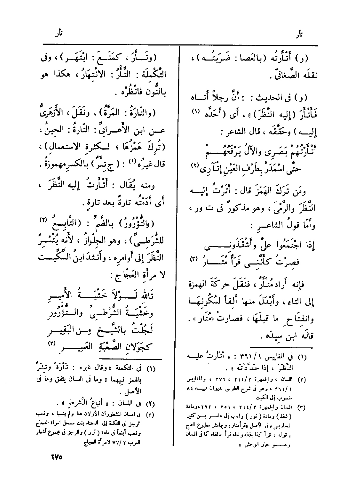 فإِنه أَراد} مُتْأَرٌ، فنَقَلَ حركَةَ الْهمزَة إِلى التاءِ، وأَبْدَلَ مِنْهَا أَلِفاً لسُكُونِهَا وانفِتَاحِ مَا قبلَهَا، فصارتْ (مُتَار) . قالَه ابْن سِيدَه.