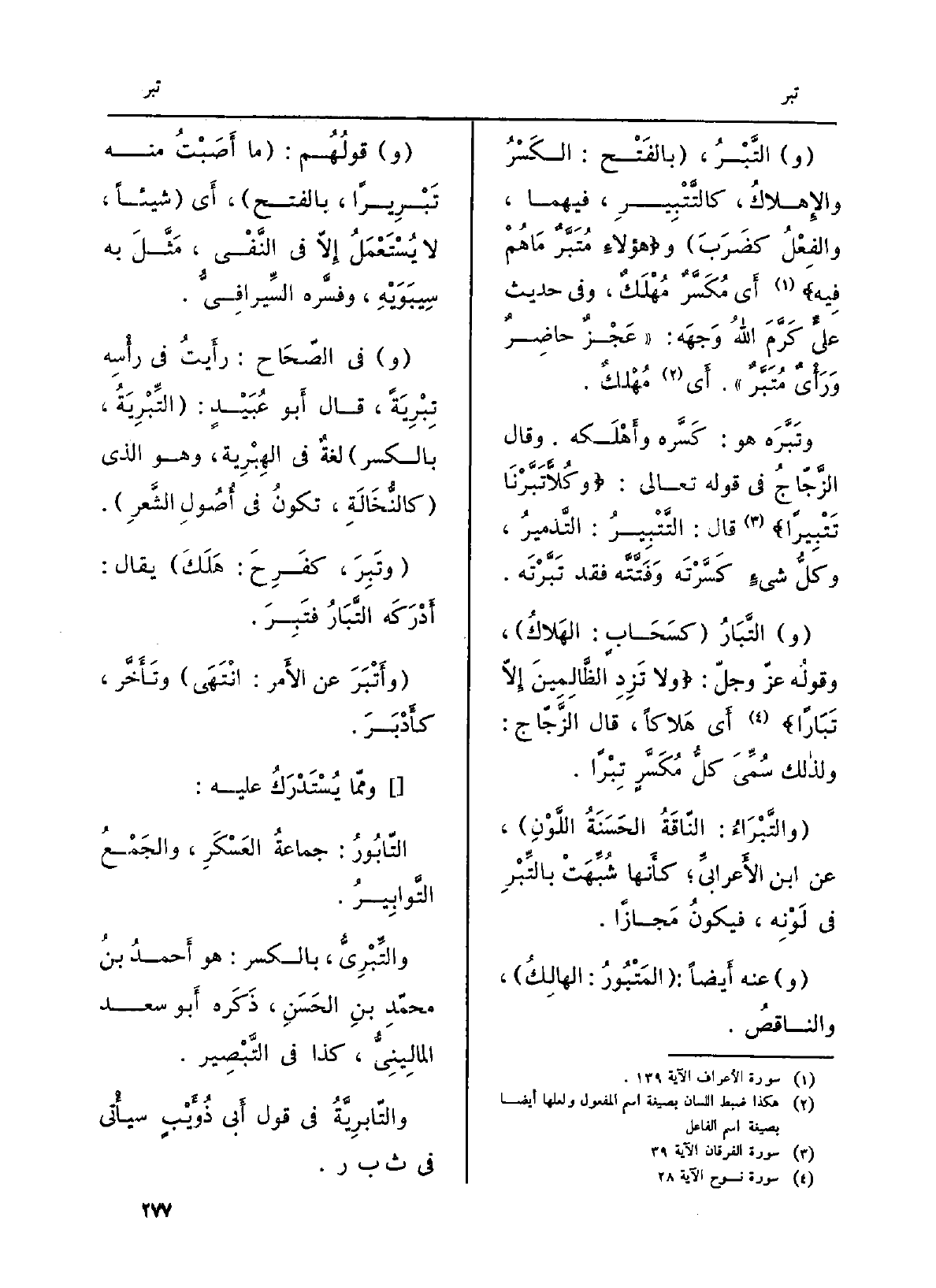 (و) التَّبَارُ (كسَحَابٍ: الهَلاكُ) ، وقولُه عزّ وجلّ: {تَزِدِ الظَّالِمِينَ إِلاَّ تَبَاراً} (نوح: 28) أَي هَلاكاً، قَالَ الزَّجّاج: ولذالك سُمِّيَ كلُّ مُكَسَّرٍ تِبْراً.