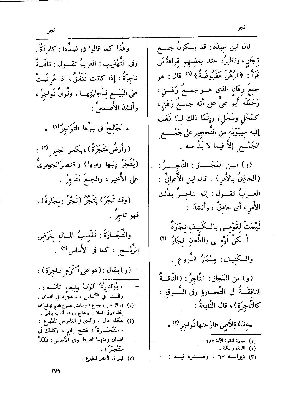قَالَ ابْن سيدَه: قد يكونُ جمع تِجَارٍ، ونظيرُه عِنْد بعضِهِم قِراءَةُ مَن قَرَأَ: {فَرِهَانٌ مَّقْبُوضَةٌ} (الْبَقَرَة: 283) قَالَ: هُوَ جمعُ رِهَانٍ الَّذِي هُوَ جمعُ رَهْنٍ، وَحَمَلَه أَبو عليَ على أَنه جمعُ رَهْنٍ، كسَحْلٍ وسُحُلٍ؛ وإِنّما ذالك لِمَا ذَهَب إِليه سِيبَوَيْهِ من التحجِير على جَمْعِ الجَمْعِ إِلَّا فِيمَا لَا بُدَّ مِنْهُ.