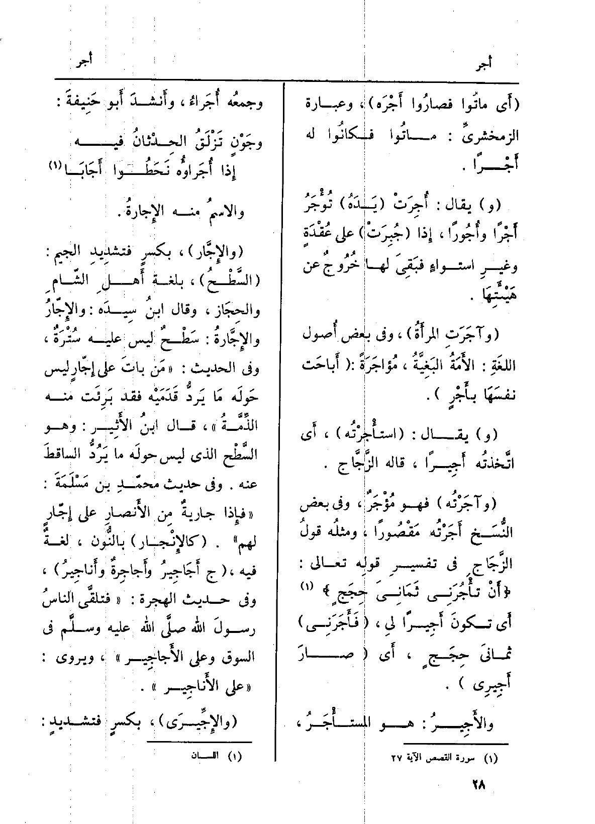(} والإِجَّار) ، بكسرٍ فتشدِيدِ الْجِيم: (السَّطْحُ) ، بلغَة أَهلِ الشّام والحِجَاز، وَقَالَ ابنُ سِيدَه: والإِجّارُ {والإِجَّارةُ: سَطْحٌ لَيْسَ عَلَيْهِ سُتْرَةٌ، وَفِي الحَدِيث: (مَن باتَ على} إِجّارٍ لَيْسَ حَولَه مَا يَردُّ قَدَمَيْه فقد بَرِئَت مِنْهُ الذِّمَّةُ) ، قَالَ ابنُ الأَثِير: وَهُوَ السَّطْح الَّذِي لَيْسَ حولَه مَا يَرُدُّ الساقطَ عَنهُ. وَفِي حَدِيث محمّدِ بن مَسْلَمَةَ: (فَإِذا جاريةٌ مِن الأَنصارِ على إِجّارٍ لَهُم) . (كالإِنْجار) بالنُّون، لغةٌ فِيهِ، (ج {أَجَاجِيرُ} وأَجاجِرةٌ وأَناجِيرُ) ، وَفِي حَدِيث الْهِجْرَة: (فتلقَّى الناسُ رسولَ الله صلَّى الله عليْه وسلَّم فِي السُّوق وعَلى {الأَجاجِير) ، ويروى: (على} الأَناجِير) .