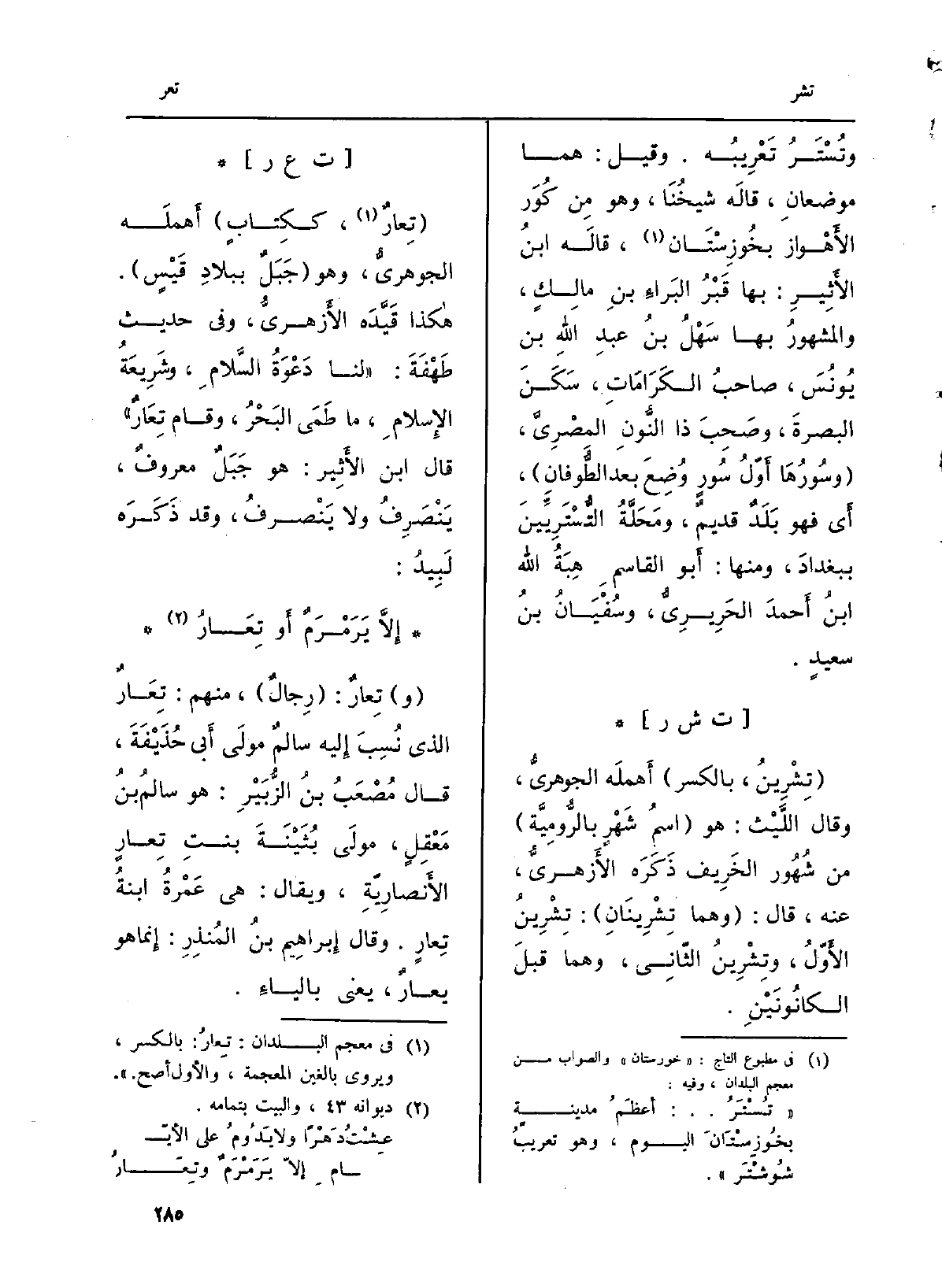 : (تِعارٌ، ككِتابٍ) أَهملَه الجوهريّ، وَهُوَ (جَبَلٌ ببلادِ قَيْسٍ) . هاكذا قَيَّدَه الأَزهريُّ، وَفِي حَدِيث طَهْفَةَ: (لنا دَعْوَةُ السَّلامِ، وشَرِيعَةُ الإِسلامِ، مَا طَمَى البَحْرُ، وَقَامَ تَعَارٌ) قَالَ ابْن الأَثِير: هُوَ جَبَلٌ معروفٌ، يَنْصَرِفُ وَلَا يَنْصرفُ، وَقد ذَكَرَه لَبِيدُ: