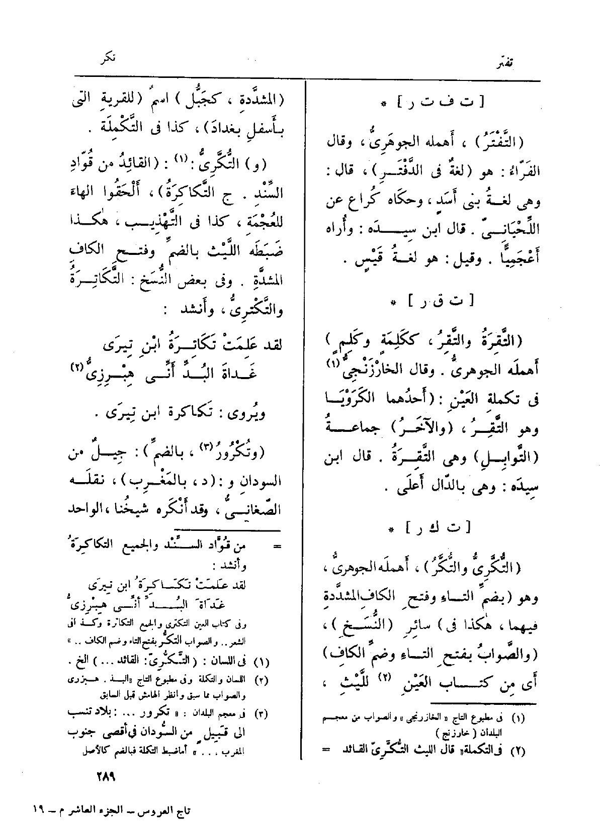 : (التُّكَّرِيُّ والتُّكَّرُ) ، أَهملَه الجوهريُّ، وَهُوَ (بضمِّ التاءِ وفتحِ الكافِ المشدَّدةِ فيهمَا، هاكذا فِي سائِرِ (النُّسَخِ) ، (والصَّوابُ بفتحِ التاءِ وضمِّ الكافِ) أَي مِن كتاب العَيْنِ للَّيْثِ، (المشدَّدةِ، كجَبُّل) إسم (للقريةِ الَّتِي بأَسفلِ بغدادَ) ، كَذَا فِي التَّكْمِلَة.