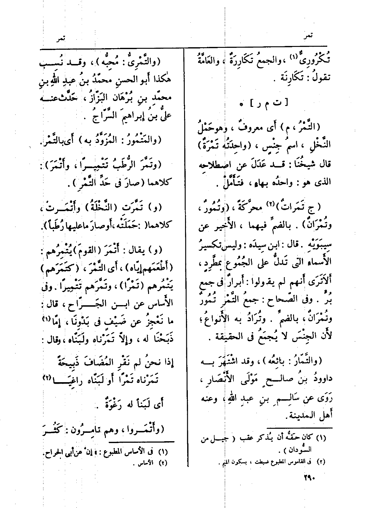 (ج تَمَراتٌ) محرَّكَةً، (وتُمُورٌ، وتُمْرَانٌ) . بالضمِّ فيهمَا، الأَخير عَن سِيبَوَيْه. قَالَ: ابْن سِيدَه: وَلَيْسَ تكسيرُ الأَسماءِ الَّتِي تَدلُّ على الجُمُوع بمطَّرِدٍ، أَلَا تَرَى أَنهم لم يَقُولُوا: أَبرارٌ فِي جمع بُرَ. وَفِي الصّحاح: معُ التَّمْرِ تُمُورٌ وتُمْرَانٌ، بالضمِّ. وتُرَادُ بِهِ الأَنواعُ، لأَن الجِنْسَ لَا يُجمَعُ فِي الْحَقِيقَة.