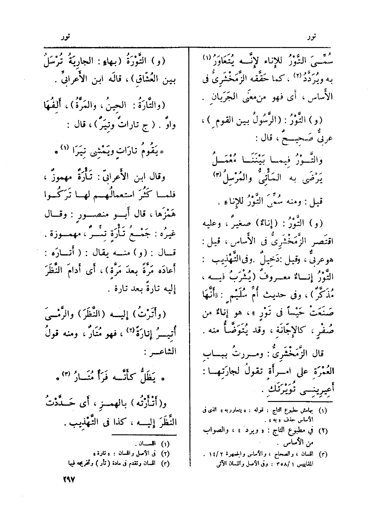 (و) التَّوْرُ: (إِناءٌ) صغيرٌ، وَعَلِيهِ اقتَصر الزَّمَخْشَرِيُّ فِي الأَساس، قيل: هُوَ عربيٌّ، وَقيل: دَخِيلٌ وَفِي التَّهْذِيب: التَّوْرُ إِناءٌ معروفٌ (يُشْرَبُ فِيهِ، مُذَكَّرٌ) ، وَفِي حَدِيث أمِّ سُلَيْمٍ: (أَنَّهَا صَنَعِتْ حَيْساً فِي} تَوْرٍ) ، هُوَ إِناءٌ من صُفْرٍ، كالإِجّانَةِ، وَقد يُتَوَضَّأُ مِنْهُ.