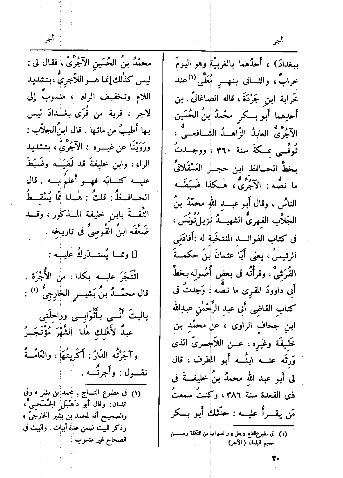 ببغدادَ) ، أَحدُهما بالغربيّة وَهُوَ اليومَ خرابٌ، وَالثَّانِي بنهرِ مُعَلًّى عِنْد خَرابة ابنِ جَرْدَةَ، قَالَه الصاغانيّ. مِن أَحدِهما أَبو بكرٍ محمّدُ بنُ الحُسَين الآجُرِّيُّ العابدُ الزّاهدُ الشافعيُّ، تُوفِّي بمكةَ سنة 360، ووجدتُ بخطِّ الْحَافِظ ابْن حجر العَسْقَلانيِّ مَا نصّه: {- الآجُرِّيُّ، هاكذا ضَبَطَه الناسُ، وَقَالَ أَبو عبدِ اللهِ محمّدُ بنُ الجَلَّاب الفِهريُّ الشهيدُ نزيلُ تُونُسَ، فِي كتاب الفوائدِ المنتخَبةِ لَهُ: أَفادَنِي الرئيسُ، يَعْنِي أَبا عثمانَ بنَ حكمةَ القُرَشِيَّ، وقرأْتُه فِي بعضِ أُصُولِه بخطِّ أَبي داوودَ المقرِي مَا نصُّه: وَجدتُ فِي كتابِ القاضِي أَبي عبدِ الرَّحْمانِ عبدِ الله بنِ جحافٍ الرَّاوِي، عَن محمّدِ بن خَلِيفَة وغيرِه، عَن اللّاجريّ الَّذِي وَرِثَه عَنهُ ابنُه أَبو الْمطرف، قَالَ لي أَبو عبد اللهِ محمدُ بنُ خليفةَ فِي ذِي الْقعدَة سنة 386 هـ، وكنتُ سمعتُ مَني قرأُ عَلَيْهِ: حدّثك أَبو بكر محمّدُ بنُ الحُسَينِ الآجُرِّيّ، فَقَالَ لي: لَيْسَ كذالك إِنما هُوَ اللّاجرِيُّ، بتَشْديد اللَّام وَتَخْفِيف الراءِ، منسوبٌ إِلى لاجر، قَرْيَة من قُرَى بغدادَ لَيْسَ بهَا أَطيبُ من مَائِهَا. قَالَ ابنُ الجلّاب: ورَوَيْنَا عَن غَيره: الآجُرِّيّ، بتَشْديد الراءِ، وَابْن خليفةَ قد لَقِيَه وضَبَطَ عَلَيْهِ كتابَه فَهُوَ أَعلمُ بِهِ. قَالَ الحافظُ: قلتُ: هاذا ممّا يُسْقِطُ الثَّقةَ بابنِ خَليفَة الْمَذْكُور، وَقد ضَعَّفَه ابنُ القُوصِيِّ فِي تاريخِه.