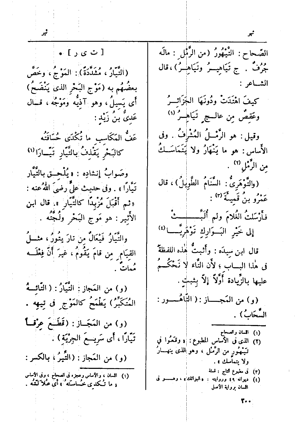 وصَوابُ إِنشادِه: (يُلْحِق} بالتَّيَّار {تَيَّاراً) . وَفِي حَدِيث عليَ رضيَ اللهُ عَنهُ: (ثمَّ أقْبَلَ مُزْبِداً} كالتَّيّارِ) . قَالَ ابْن الأَثِير: هُوَ مَوج البَرِ ولُجَّتُه.