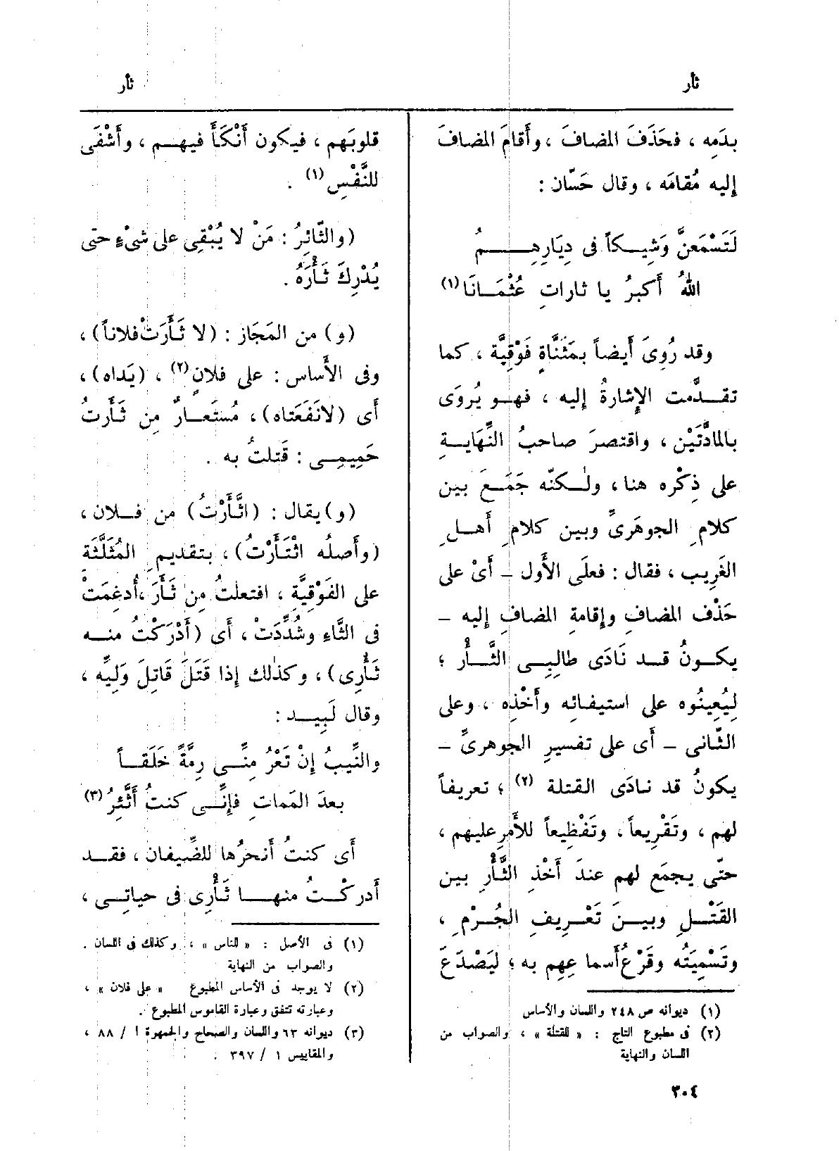 وَقد رُوِيَ أَيضاً بمَثَنَّاةٍ فَوْقِيَّة، كَمَا تقدَّمت الإِشارةُ إِليه، فَهُوَ يُروَى بالمادَّتَيْنِ، واقتصرَ صاحبُ النِّهَايةِ على ذِكْره هُنَا، ولاكنّه جَمَعَ بَين كلامِ الجوهَريِّ وَبَين كمِ أَهلِ الغَرِيب، فَقَالَ: فعَلَى الأَول أَيْ على حَذْف المضافِ وإِقامةِ المضافِ إِليه يكونُ قد نَادَى طالِبِي الثَّأْر؛ لِيُعِينُوه على استيفائِه وأَخْذِه، وعَلى الثّاني أَي على تفسيرِ الجوهريِّ يكونُ قد نادَى القتلة؛ تعريفاً لَهُم، وتَقْرِيعاً، وتَفْظِيعاً للأَمرِ عَلَيْهِم، حتّى يجمَع لَهُم عندَ أَخْذه {الثَّأْرِ بَين القَتْلِ وبينَ تَعْرِيفِ الجُرْمِ، وتَسْمِيَتُه وقَرْعُ أَسماعِهِم بِهِ؛ ليَصْدَعَ قلوبَهم، فَيكون أَنْكَأَ فيهم، وأَشْفَى للنَّفْسِ.