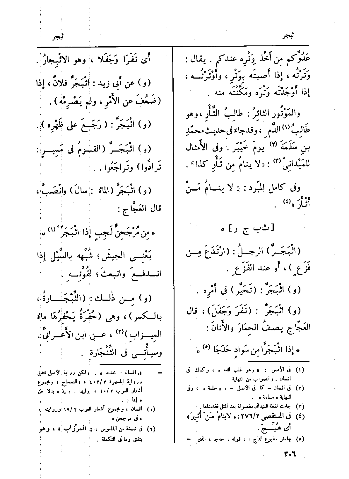 (و) اثْبَجَرَّ (القومُ فِي مَسِيرٍ: تَرادُّوا) وتَراجَعُوا (و) اثْبَجَرَّ (الماءُ: سالَ) وانْصَبَّ، قَالَ العَجَّاج: