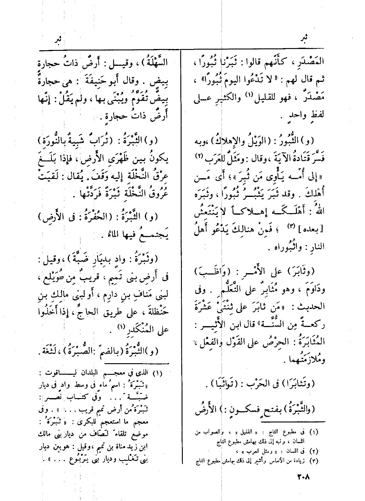 (و) الثَّبْرَةُ: (تُرَابٌ شَبِيهٌ بالنُّورَةِ) يكونُ بَين ظَهْرَي الأَرضِ، فإِذا بَلَغَ عِرْقُ النَّخْلَةِ إِليه وَقَفَ. يُقال: لَقيَتْ عُرُوقُ النَّخْلَةِ ثَبْرَةً فَرَدَّتْها (و) الثَّبْرَةُ: (الحُفْرَةُ: فِي الأَرضِ) يَجتمعُ فِيهَا الماءُ.
