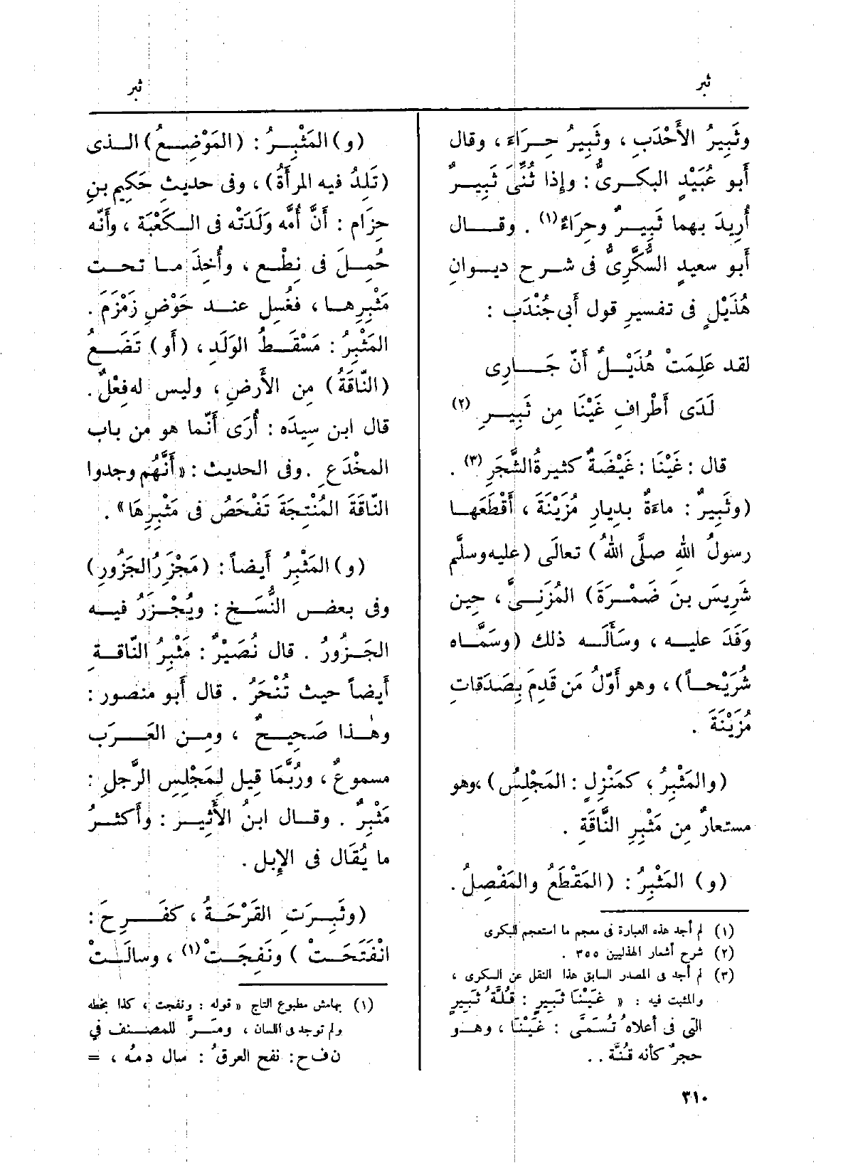 (و) المَثْبِرُ أَيضاً: (مَجُزَرُ الجَزُورِ) وَفِي بعض النُّسَخ: ويُجْزَرُ فِيهِ الجَزُورُ. قَالَ نُصَيْرٌ: مَثْبِرُ النّاقةِ أَيضاً حَيْثُ تُنْحَرُ. قَالَ أَبو مَنْصُور: وهاذا صَحِيحٌ، ومِن العَرَب مسموعٌ، ورُبَّمَا قِيل لِمَجْلِسِ الرَّجلِ: مَثْبِرٌ. وَقَالَ ابنُ الأَثِير: وأَكثرُ مَا يُقَال فِي الإِبل.