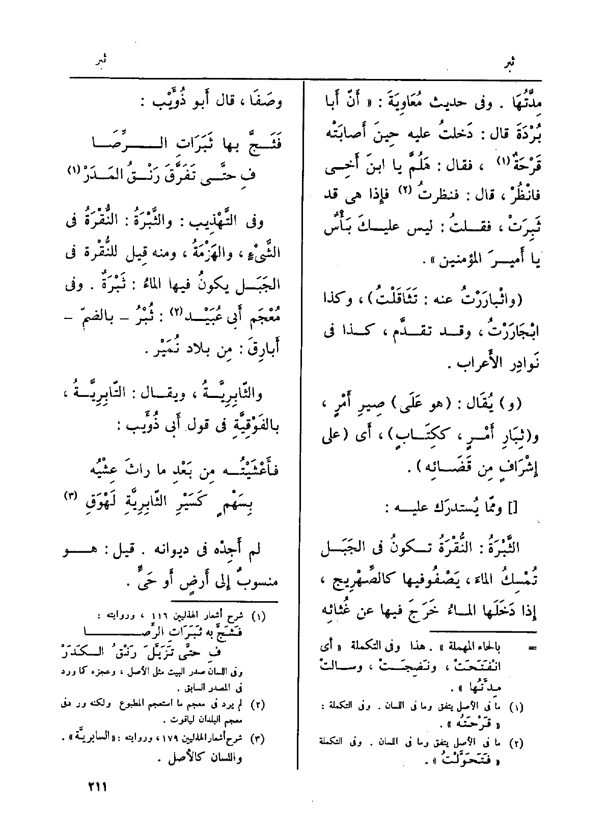 الثَّبْرَةُ: النُّقْرَةُ تكونُ فِي الجَبَل تُمْسِكُ الماءَ، يَصْفُو فِيهَا كالصِّهْرِيج، إِذا دَخَلَها الماءُ خَرَجَ فِيهَا عَن غُثائِه وصَفَا، قَالَ أَبو ذُؤَيْب: