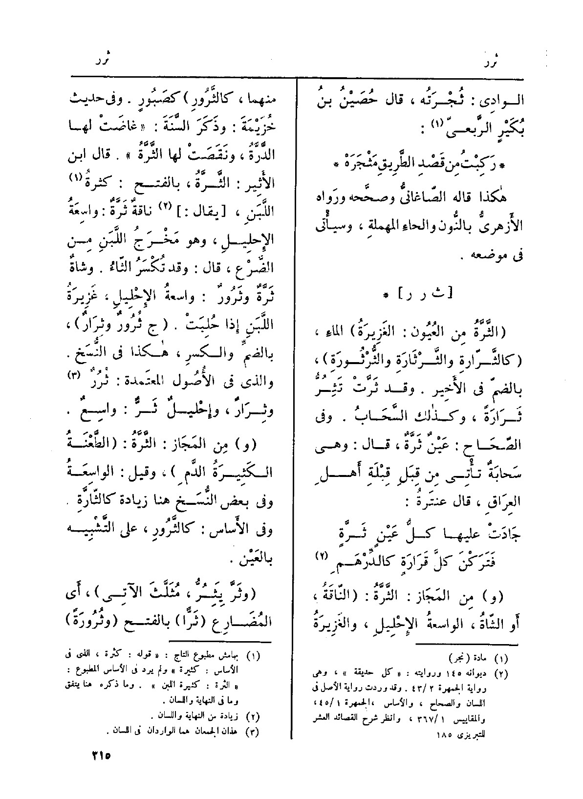 : ( {الثَّرَّةُ مِن العُيُون: الغَزِيرَةُ) الماءِ، (} كالثَّرّارةِ {والثَّرْثَارَةِ} والثُّرْثُورَةِ) ، بالضمّ فِي الأَخِير. وَقد {ثَرَّتْ} تَثُرُّ {ثَرَارَةً، وكذالك السَّحَابُ. وَفِي الصّحَاح: عَيْنٌ} ثَرَّةٌ، قَالَ: وَهِي سَحابَةٌ تأْتِي مِن قِبَلِ قِبْلَةِ أَهلِ العِرَاقِ، قَالَ عنتَرةُ: