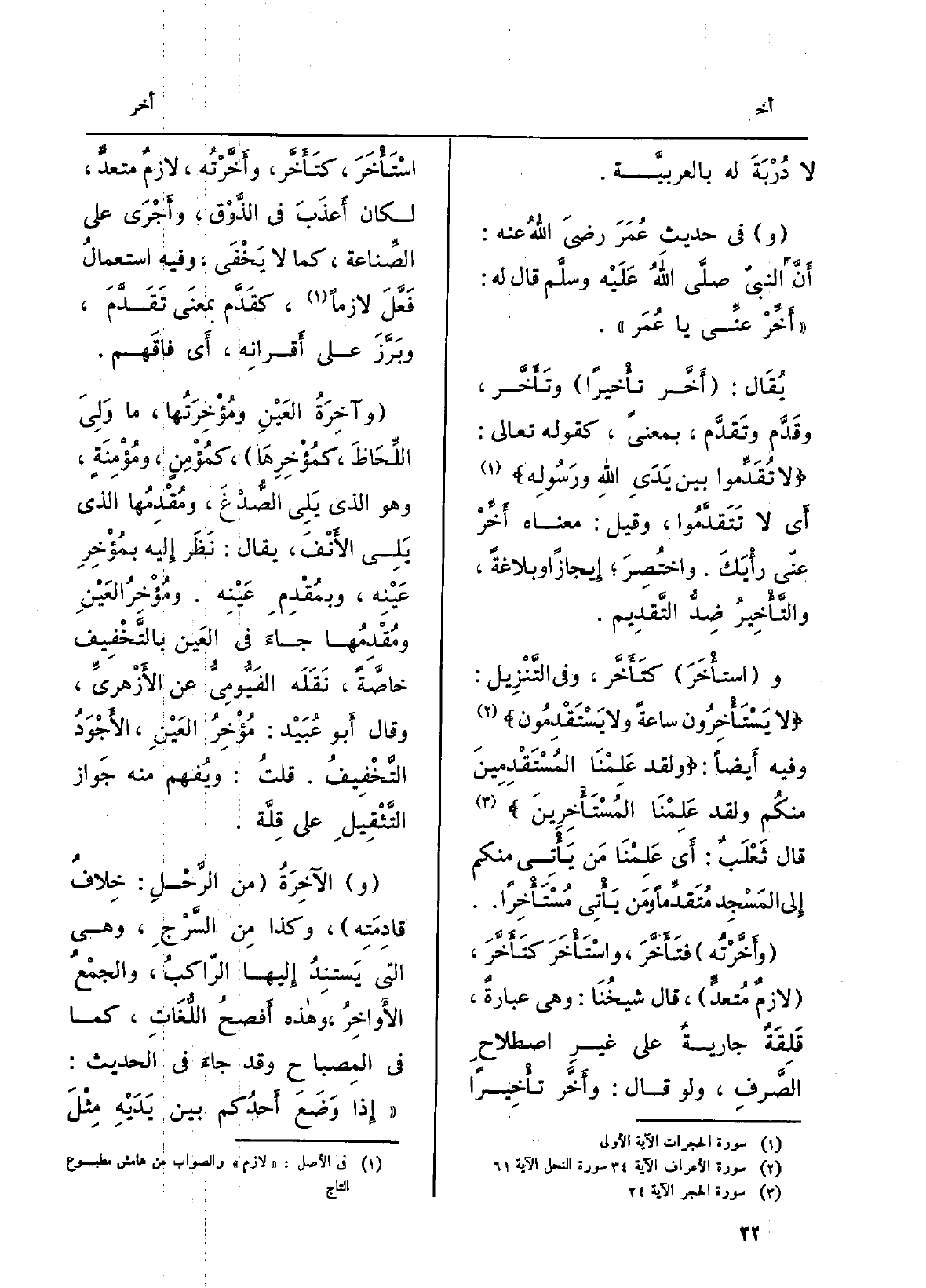 يُقَال: ( {أَخَّر} تأْخيراً) وتَأَخَّر، وقَدَّم وتَقدَّم، بِمَعْنى، كَقَوْلِه تَعَالَى: {لاَ تُقَدّمُواْ بَيْنَ يَدَىِ اللَّهِ وَرَسُولِهِ} (الحجرات: 1) أَي لَا تَتَقدَّمُوا، وَقيل: مَعْنَاهُ {أَخِّرّ عنّى رأْيَكَ. واختُصِرَ؛ إِيجازاً وبلاغةً،} والتَّأْخِيرُ ضِدُّ التَّقدِيم.