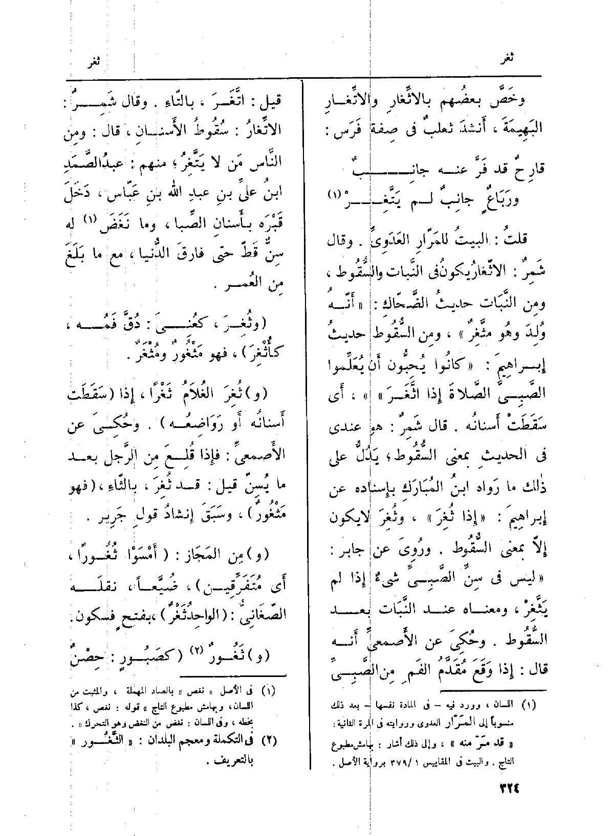 قلتُ: البيتُ للمَرْارِ العَدَوِيِّ. وَقَالَ شَمِرٌ: الاثّغارُ يكونُ فِي النَّبات والسُّقُوط، ومِن النَّبَات حديثُ الضَّحّاك: (أَنّهُ وُلِدَ وهُو مثَّغِرٌ) ، ومِن السُّقُوط حديثُ إِبراهِيمَ: (كانُوا يُحِبُّون أَن يُعَلِّموا الصَّبِيَّ الصَّلاةَ إِذا اثَّغَرَ) ، أَي سَقَطَتْ أَسنانُه. قَالَ شَمِرٌ هُوَ عِنْدِي فِي الحديثِ بِمَعْنى السُّقُوط؛ يَدُلُّ على ذالك مَا رَواه ابنُ المُبَارَكِ بإِسناده عَن إِبراهِيمَ: (إِذا ثُغِرَ) ، وثُغِرَ لَا يكون إِلّا بِمَعْنى السُّقُوط. ورُوِيَ عَن جَابر: (لَيْسَ فِي سِنِّ الصَّبِيِّ شيءٌ إِذا لم يَثَّغِرُ، وَمَعْنَاهُ عِنْد النَّبَات بعد السُّقُوط. وحُكِيَ عَن الأَصمعيِّ أَنه قَالَ: إِذا وَقَعَ مُقَدَّمُ الفَمِ مِن الصَّبِيِّ قيل: اتَّغَر، بالتّاءِ. وَقَالَ شَمِرٌ: الاتِّغارُ: سُقُوطُ الأَسنانِ، قَالَ: ومِن النَّاس مَن لَا يَتَّغِرُ؛ مِنْهُم: عبدُ الصَّمَدِ بنُ عليِّ بن عبدِ الله بنِ عَبّاس، دَخَل قَبْرَه بأَسنانِ الصِّبا، وَمَا نَغَضَ لَهُ سِنٌّ قَطّ حَتَّى فارقَ الدُّنيا، مَعَ مَا بَلَغَ مِن العُمر.