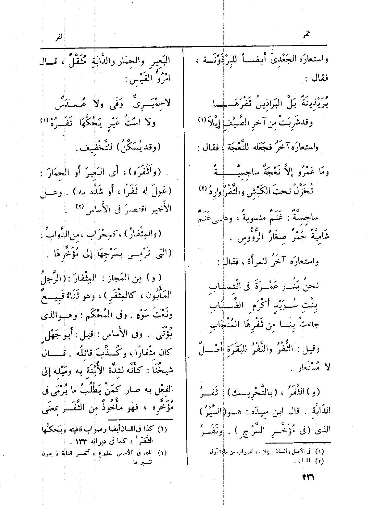 (و) مِن المَجَاز: المِثْفارُ: (الرَّجلُ المَأْبُون، كالمِثْفَرِ) ، وَهُوَ ثَنَاءٌ قَبِيحٌ ونَعْتُ سَوْءٍ. وَفِي المُحْكَم: وَهُوَ الَّذِي يُؤْتَى. وَفِي الأَساس: قيل: أَبو جَهْلٍ كَانَ مِثْفاراً، وكُذِّبَ قائِلُه. قَالَ شيخُنَا: كأَنَّه لشِدَّة الأُبْنَةِ بِهِ ومَيْلِه إِلى الفِعْل بِهِ صَار كمَنْ يَطْلُبُ مَا يُرْمَى فِي مُؤَخَّرِه؛ فَهُوَ مأْخُوذٌ مِن الثَّفَر بمعنَى