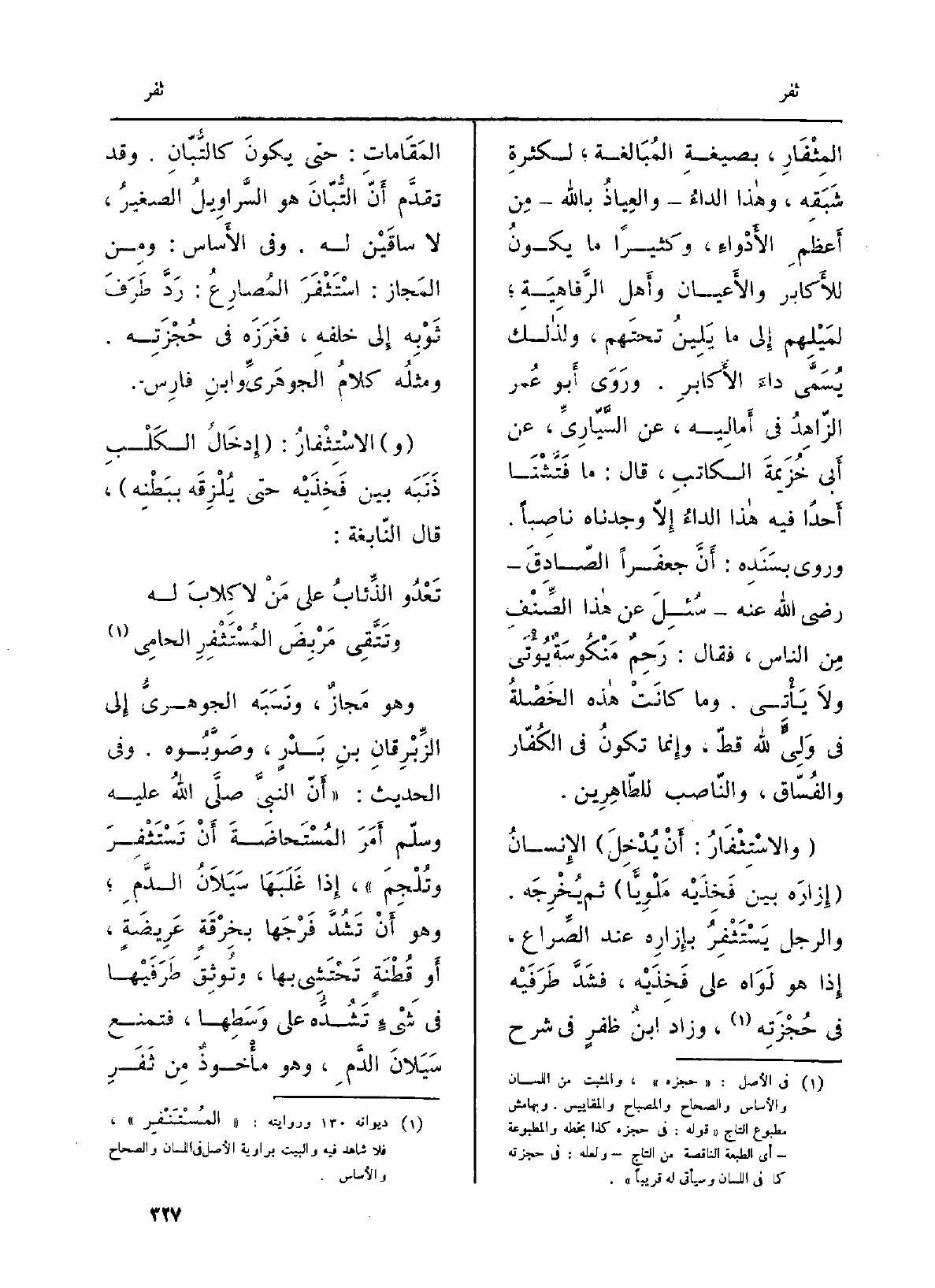 المِثْفَارِ، بصيغةِ المُبَالغة؛ لكثرةِ شَبَقِه، وهاذا الداءُ والعِياذُ بِاللَّه مِن أَعظمِ الأَدْواءِ، وَكَثِيرًا مَا يكونُ للأَكابر والأَعيان وأَهل الرَّفاهِيَة؛ لمَيْلهم إِلى مَا يَلِينُ تحتَهم، ولذالك يُسَمَّى داءَ الأَكابرِ. ورَوَى أَبو عُمر الزّاهِدُ فِي أَمالِيه، عَن السَّيّارِيِّ، عَن أَبي خُزَيمةَ الكاتبِ، قَالَ: مَا فَتَّشْنَا أَحداً فِيهِ هاذا الداءُ إِلّا وَجَدْنَاهُ ناصِباً وروى بسَنَدهِ: أَنَّ جعفَراً الصّادِقَ رَضِي الله عَنهُ سُئِلَ عَن هاذا الصِّنْفِ مِن النَّاس، فَقَالَ: رَحِمٌ مَنْكُوسَةٌ يُؤْتَى ولَا يَأْتِي. وَمَا كانَتْ هاذه الخَصْلةُ فِي وَلِيَ لله قطّ، وإِنما تكونُ فِي الكُفّار والفُسّاق، والنّاصب للطّاهِرِين.