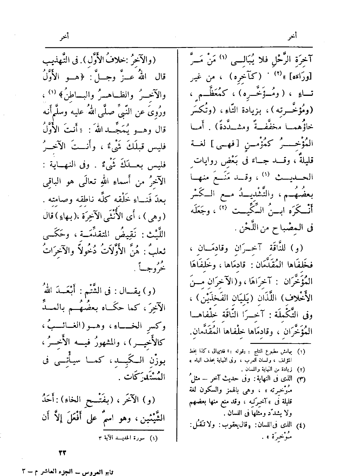 كتاب م كتاب (} والآخرُ: خلافُ الأَوَّلِ) . فِي التَّهذيب قَالَ اللهُ عزَّ وجلَّ: {هُوَ الاْوَّلُ وَالاْخِرُ وَالظَّاهِرُ وَالْبَاطِنُ} (الْحَدِيد: 3) ، ورُوِيَ عَن النّبيِّ صلَّى اللهُ عليْه وسلَّم أَنه قَالَ وَهُوَ يُمَجِّد اللهَ: (أَنتَ الأَوَّلُ فَلَيْسَ قبلَكَ شَيْءٌ، وأَنتَ {الآخرُ فَلَيْسَ بعدَكَ شَيْءٌ. وَفِي النِّهَايَة: الآخِرُ من أَسماءِ اللهِ تعالَى هُوَ الباقِي بعدَ فَناءِ خَلْقِه كلِّه ناطِقِه وصامِتِه. (وَهِي) ، أَي الأُنْثَى} الآخِرَة، (بهاءٍ) قَالَ اللَّيْث: نَقِيضُ المتقدِّمَةِ، وحَكَى ثعلبٌ: هُنَّ الأَوَّلَاتُ دُخُولاً {والآخِرَاتُ خُرُوجاً.