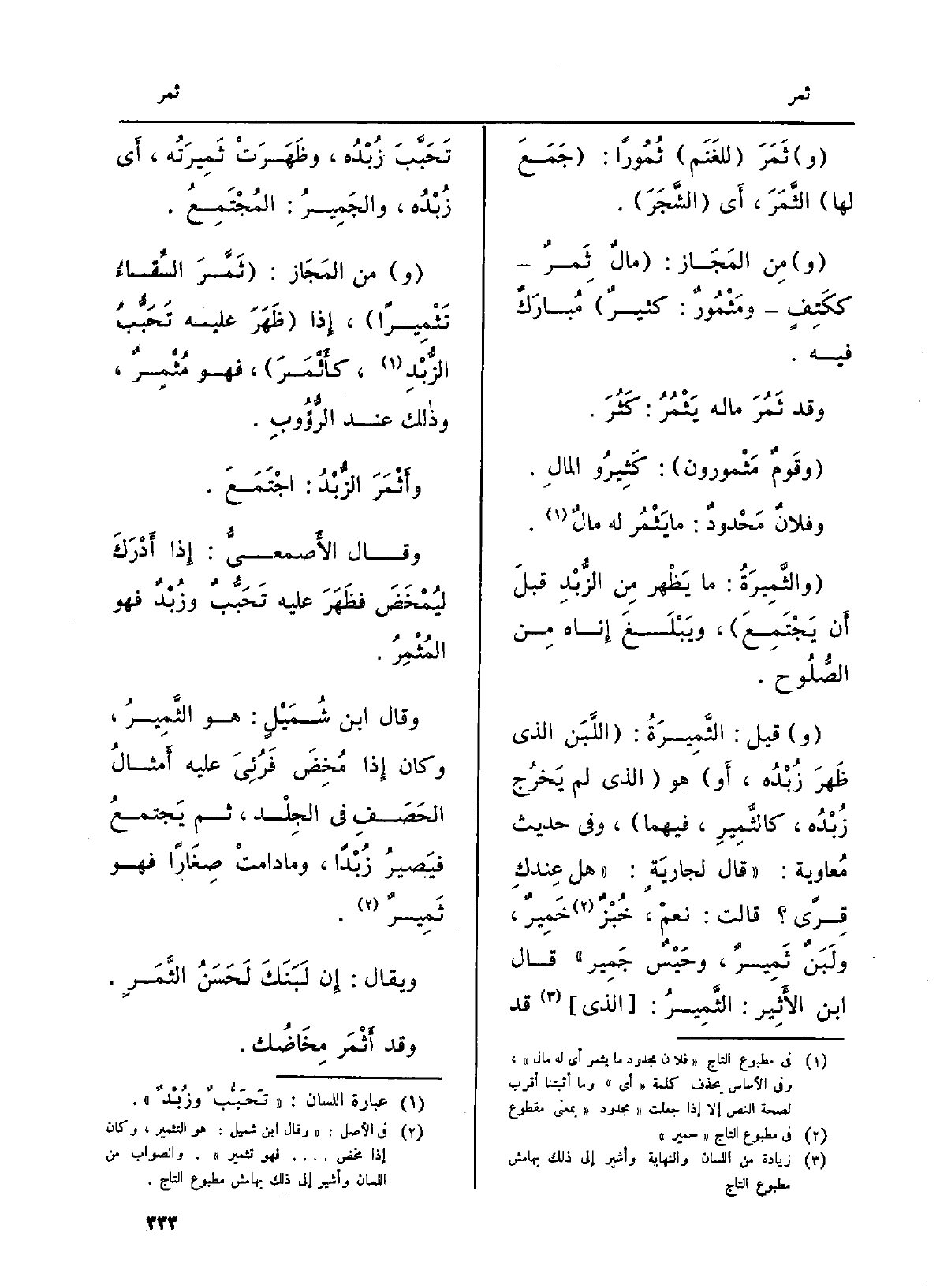 (و) قيل: الثَّمِيرَةُ: (اللَّبَن الَّذِي ظَهرَ زُبْدُه، أَو) هُوَ (الَّذِي لم يَخرُج زُبْدُه، كالثَّمِيرِ، فيهمَا) ، وَفِي حَدِيث مُعاوية: (قَالَ لجاريَةٍ: (هَل عِندكِ قِرىً؟ قَالَت: نعمْ، خُبْزٌ خَمِيرٌ، ولَبَنٌ ثَمِيرٌ، وحَيْسٌ جَمِير) قَالَ ابْن الأَثِير: الثَّمِيرُ: (الَّذِي) قد تَحَبَّبَ زُبْدُه، وظَهَرَتْ ثَمِيرَتُه، أَي زُبْدُه، والجَمِيرُ المُجْتَمِعُ.