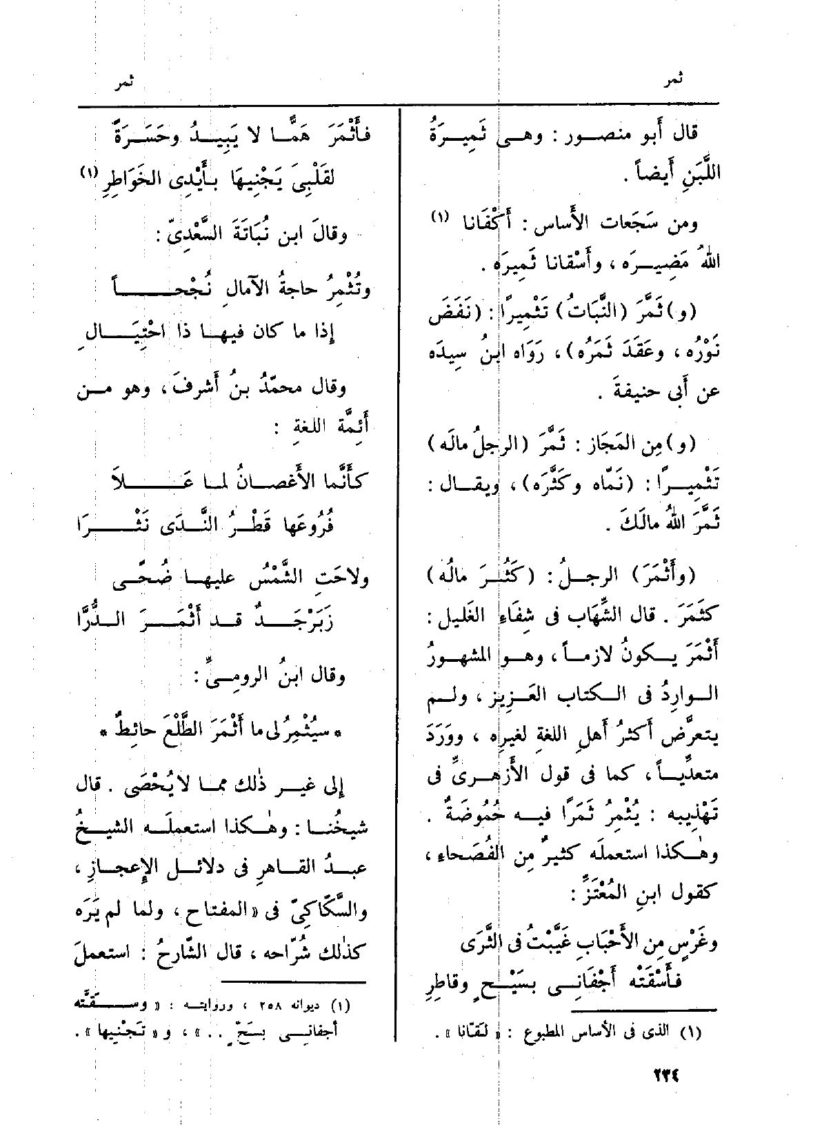 (وأَثْمَرَ) الرجلُ: (كَثُرَ مالُه) كثَمَرَ. قَالَ الشِّهَاب فِي شِفَاءِ الغَليل: أَثْمَرَ يكونُ لَازِما، وَهُوَ المشهورُ الوارِدُ فِي الْكتاب العَزِيز، وَلم يتعرَّض أَكثرُ أَهلِ اللغةِ لغيرِه، ووَرَدَ متعدِّياً، كَمَا فِي قَول الأَزهريِّ فِي تَهْذِيبه: يُثْمِرُ ثَمَراً فِيهِ حُمُوضَةٌ. وهاكذا استعلمَه كثيرٌ مِن الفُصَحاءِ، كَقَوْل ابنِ المُعْتَزِّ: