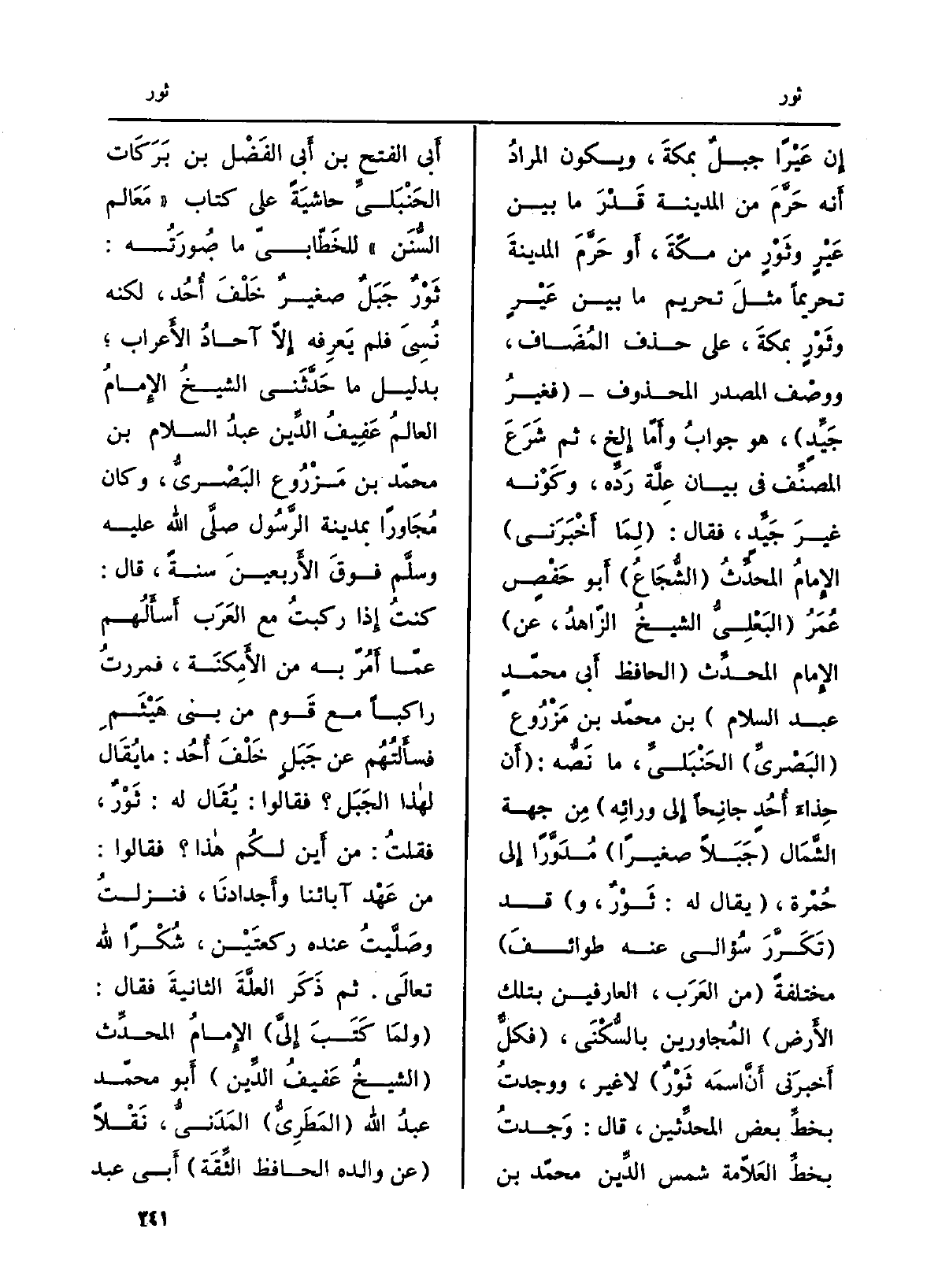 إِن عَيْراً جبلٌ بمكةَ، وَيكون المرادُ أَنه حَرَّمَ من الْمَدِينَة قَدْرَ مَا بَين عَيْرٍ وثَوْرٍ من مكّةَ، أَو حَرَّمَ المدينةَ تَحْرِيمًا مثلَ تَحْرِيم مَا بَين عَيْرٍ وثَوْرٍ بمكةَ، على حذف المُضَاف، ووصْف الْمصدر الْمَحْذُوف (فغيرُ جَيِّدٍ) ، هُوَ جوابُ وأَمّا إِلخ، ثمَّ شَرَعَ المصنِّف فِي بَيَان عِلَّة رَدِّه، وكَوْنه غيرَ جَيِّدٍ، فَقَالَ: (لِمَا أَخْبَرَني) الإِمامُ المحدِّثُ (الشُّجَاعُ) أَبو حَفْصٍ عُمَرُ (البَعْلِيُّ الشيخُ الزّاهدُ، عَن) الإِمام المحدِّث (الْحَافِظ أَبي محمّدٍ عبد السَّلَام) بن محمّد بن مَزْرُوع (البَصْريِّ) الحَنْبَليِّ، مَا نَصّه: (أَن حِذاءَ أُحُدٍ جانِحاً إِلى ورائِه) مِن جِهَة الشَّمَال (جَبَلاً صَغِيرا) مُدَوَّراً إِلى حُمْرة، (يُقَال لَهُ: ثَوْرٌ، و) قد (تَكَرَّرَ سُؤالي عَنهُ طوائفَ) مُخْتَلفَة (من العَرَب، العارفين بِتِلْكَ الأَرض) المُجاورين بالسُّكْنَى، (فكلٌّ أَخبرَني أَنَّ اسمَه ثَوْرٌ) لَا غير، ووجدتُ بخطِّ بعض المحدِّثين، قَالَ: وَجدتُ بخطِّ العَلّامة شمس الدِّين محمّد بن أَبي الْفَتْح بن أَبي الفَضْل بن بَرَكَات الحَنْبَليِّ حاشيَةً على كتاب (مَعَالم السنَن) للخَطّابيّ مَا صُورَتُه: ثَوْرٌ جَبَلٌ صغيرٌ خَلْفَ أُحُد، لكنه نُسِيَ فَلم يَعرِفه إِلّا آحادُ الأَعراب؛ بِدَلِيل مَا حَدَّثَني الشيخُ لإِمامُ العالمُ عَفِيفُ الدِّين عبدُ السَّلَام بن محمّد بن مَزْرُوع البَصريُّ، وَكَانَ مُجَاوراً بِمَدِينَة الرَّسُول صلَّى اللهُ عليْه وسلَّم فوقَ الأَربعينَ سنة، قَالَ: كنتُ إِذا ركبتُ مَعَ العَرَب أَسأَلُهم عمّا أَمُرّ بِهِ من الأَمِكنَة، فمررتُ رَاكِبًا مَعَ قَوم من بني هَيْثَمِ فسأَلتُهُم عَن جَبَلٍ خَلْفَ أُحُد: مَا يُقَال لهاذا الجَبَل؟ فَقَالُوا: يُقَال لَهُ: ثَوْرٌ، فقلتُ: من أَين لكُم هاذا؟ فَقَالُوا: من عَهْد آبَائِنَا وأَجدادنَا، فنزلتُ وصَلَّيتُ عِنْده ركعتَيْن، شُكْراً لله تعالَى. ثمَّ ذَكَر العلَّةَ الثانيةَ فَقَالَ: (ولمَا كَتَبَ إِليَّ) الإِمامُ المحدِّث (الشيخُ عَفيفُ الدِّين) أَبو محمّد عبدُ الله (المَطَرِيُّ) المَدَنيُّ، نَقْلاً (عَن وَالِده الْحَافِظ الثِّقَة) أَبي عبد