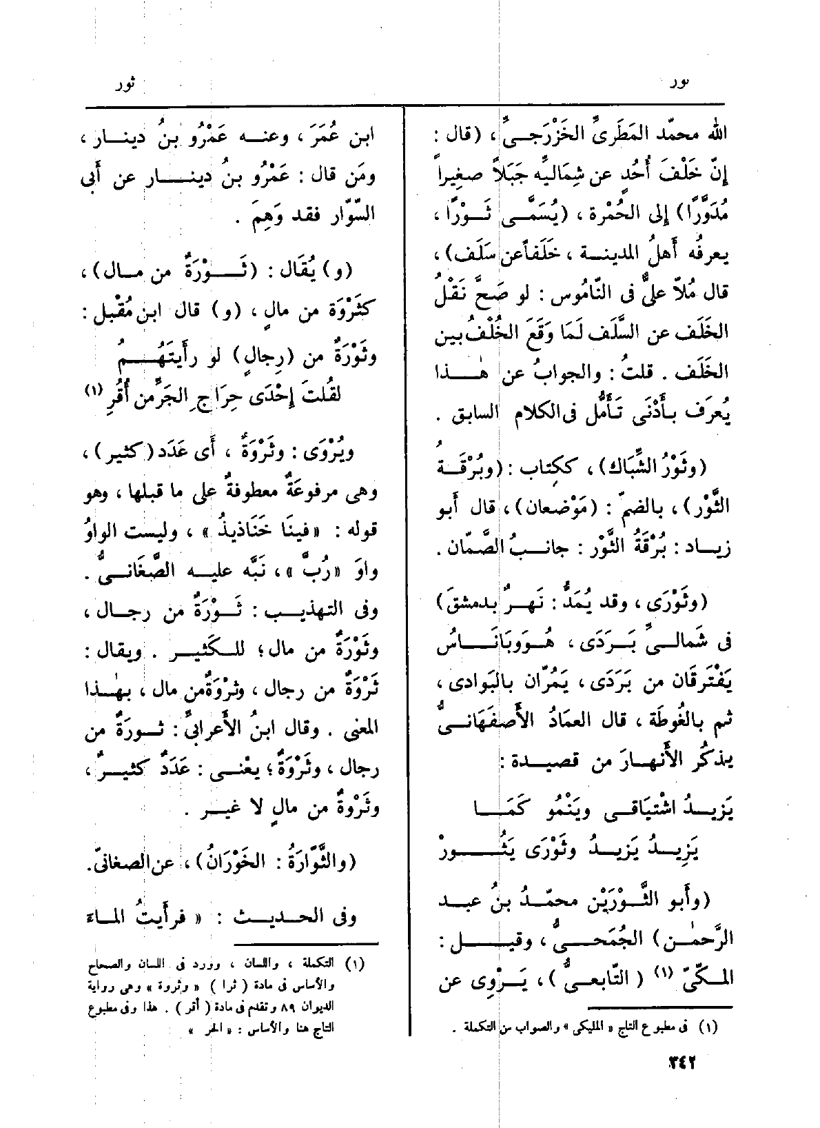 الله محمّد المَطريِّ الخَزْرَجيِّ، (قَالَ: إِنّ خَلْفَ أُحُدٍ عَن شِمَاليِّه جَبَلاً صغِيراً مُدَوَّراً) إِلى الحُمْرة، (يُسَمَّى ثَوْراً، يعرفُه أَهلُ الْمَدِينَة، خَلَفاً عَن سَلَف) ، قَالَ مُلّا عليٌّ فِي النّامُوس: لَو صَحَّ نَقْلُ الخَلَف عَن السَّلَف لَمَا وَقَعَ الخُلْفُ بَين الخَلَف. قلتُ: والجوابُ عَن هاذا يُعرَف بأَدْنَى تَأَمُّل فِي الْكَلَام السَّابِق.