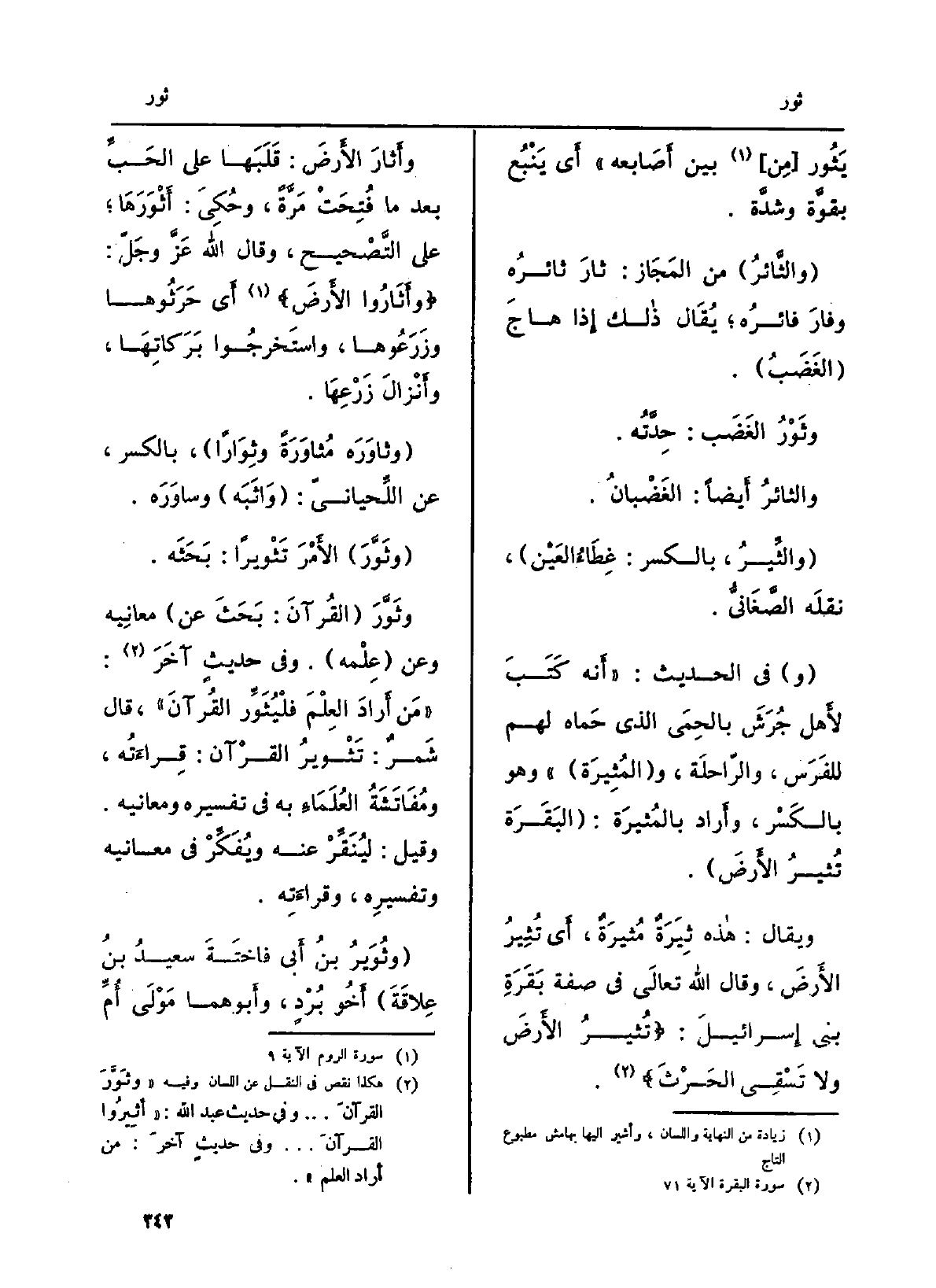 وثَوَّرَ (القُرآنَ: بَحَثَ عَن) معانِيه وَعَن (علْمه) . وَفِي حديثٍ آخَرَ: مَن أَرادَ العِلْمَ {فلْيُثَوِّر القُرآنَ) ، قَالَ شَمرٌ:} تَثْويرُ القرْآن: قِراءَتُه، ومُفَاتَشَةُ العُلَمَاءِ بِهِ فِي تَفْسِيره ومعانيه. وَقيل: ليُنَقِّرْ عَنهُ ويُفَكِّكْ فِي مَعَانِيه وتفسيرِه، وقراءَته.