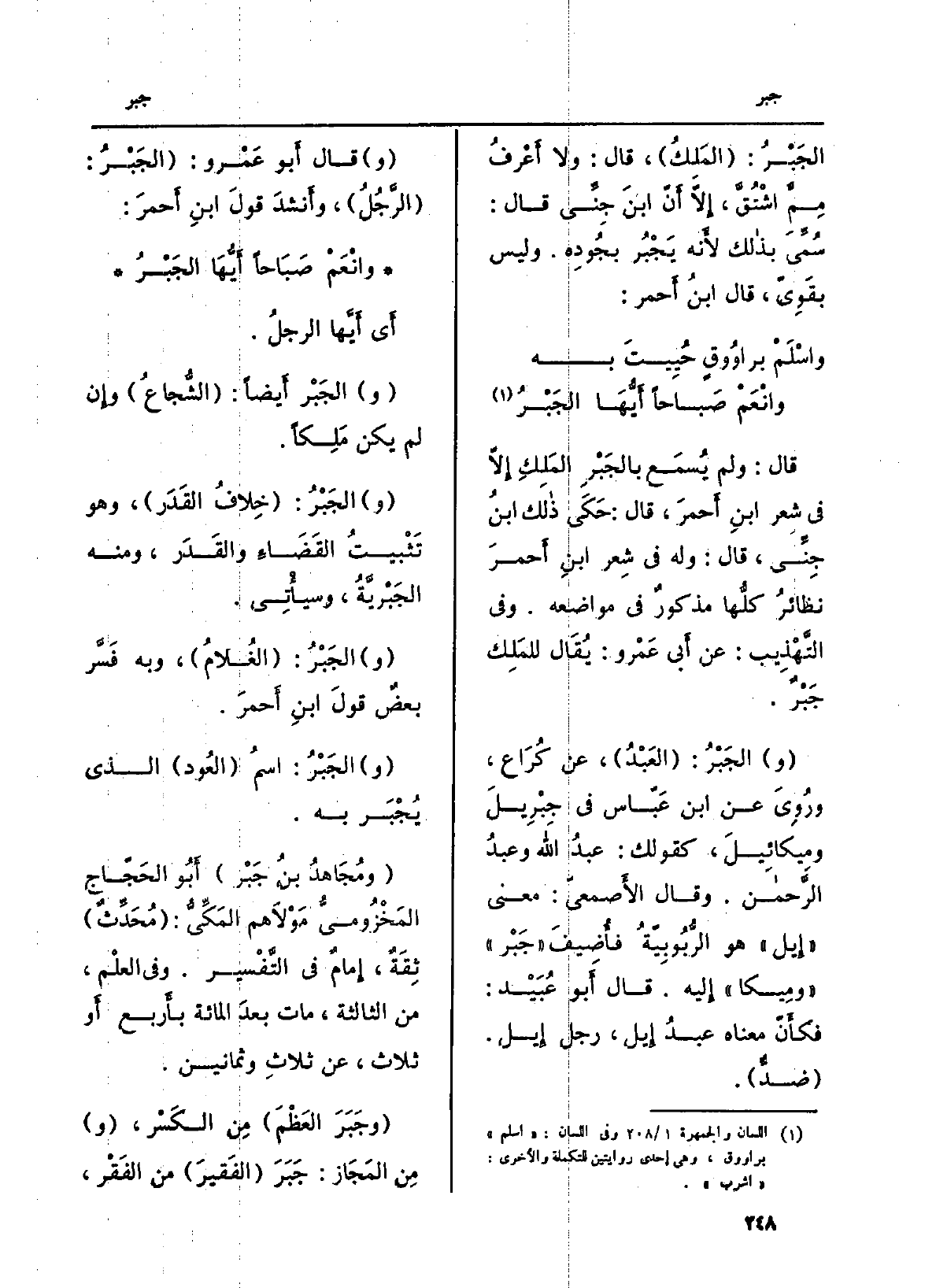 قَالَ: وَلم يُسمَع بالجَبْرِ المَلِكِ إِلّا فِي شِعر ابنِ أَحمرَ، قَالَ: حَكَى ذالك ابنُ جنِّي، قَالَ: وَله فِي شِعر ابنِ أَحمرَ نظائرُ كلُّا مذكورٌ فِي موَاضعه. وَفِي التَّهْذِيب: عَن أَبي عَمْرو: يُقَال للمَلِك جَبْرٌ.