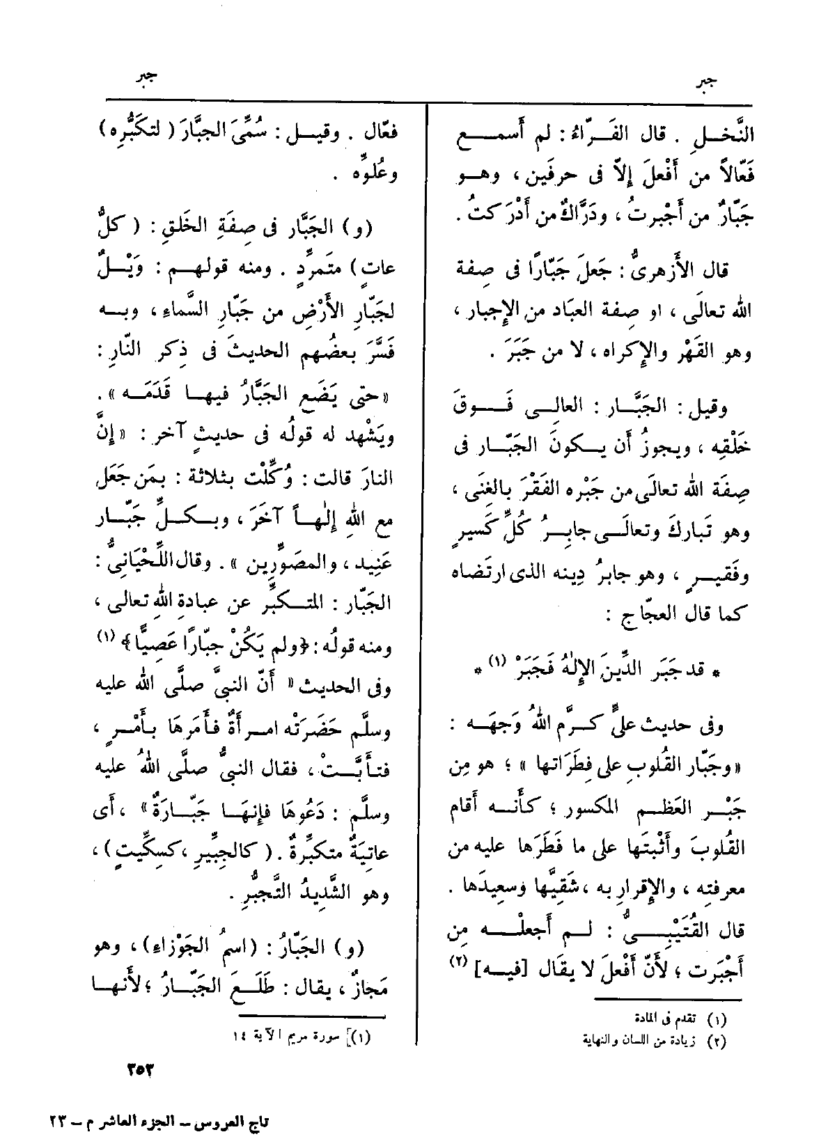 (و) الجَبَّار فِي صِفَةِ الخَلقِ: (كلُّ عاتٍ) متَمرِّدٍ. وَمِنْه قَوْلهم: وَيْلٌ لجَبّارِ الأَرْضِ من جَبّارِ السَّماءِ، وَبِه فَسَّرَ بعضُم الحديثَ فِي ذِكر النّارِ: (حَتَّى يَضَع الجَبَّارُ فِيهَا قَدَمَه) . ويَشْهد لَهُ قولُه فِي حديثٍ آخر: (إِنَّ النارَ قَالَت: وُكِّلْت بِثَلَاثَة: بمَن جَعَل مَعَ اللهِ إِلاهاً آخَرَ، وبكلِّ جَبّار عَنِيد، والمصَوِّرِين) . وَقَالَ اللِّحْيَانِيُّ: الجَبّار: المتكبِّر عَن عبادةِ الله تَعَالَى، وَمِنْه قولهُ: {وَلَمْ يَكُن جَبَّاراً عَصِيّاً} (مَرْيَم: 14) وَفِي الحَدِيث (أَن النبيَّ صلَّى الله عَلَيْهِ وسلَّم حَضَرَتْه امرأَةٌ فأَمَرهَا بأَمْرٍ، فتأَبَّتْ، فَقَالَ النبيُّ صلَّى اللهُ عليْه وسلَّم: دَعُوهَا فإِنهَا جَبّارَةٌ) ، أَي عاتِيَةٌ متكبِّرةٌ. (كالجِبيِّرِ، كسِكِّيتِ) ، وَهُوَ الشَّدِيدُ التَّجبُّرِ.