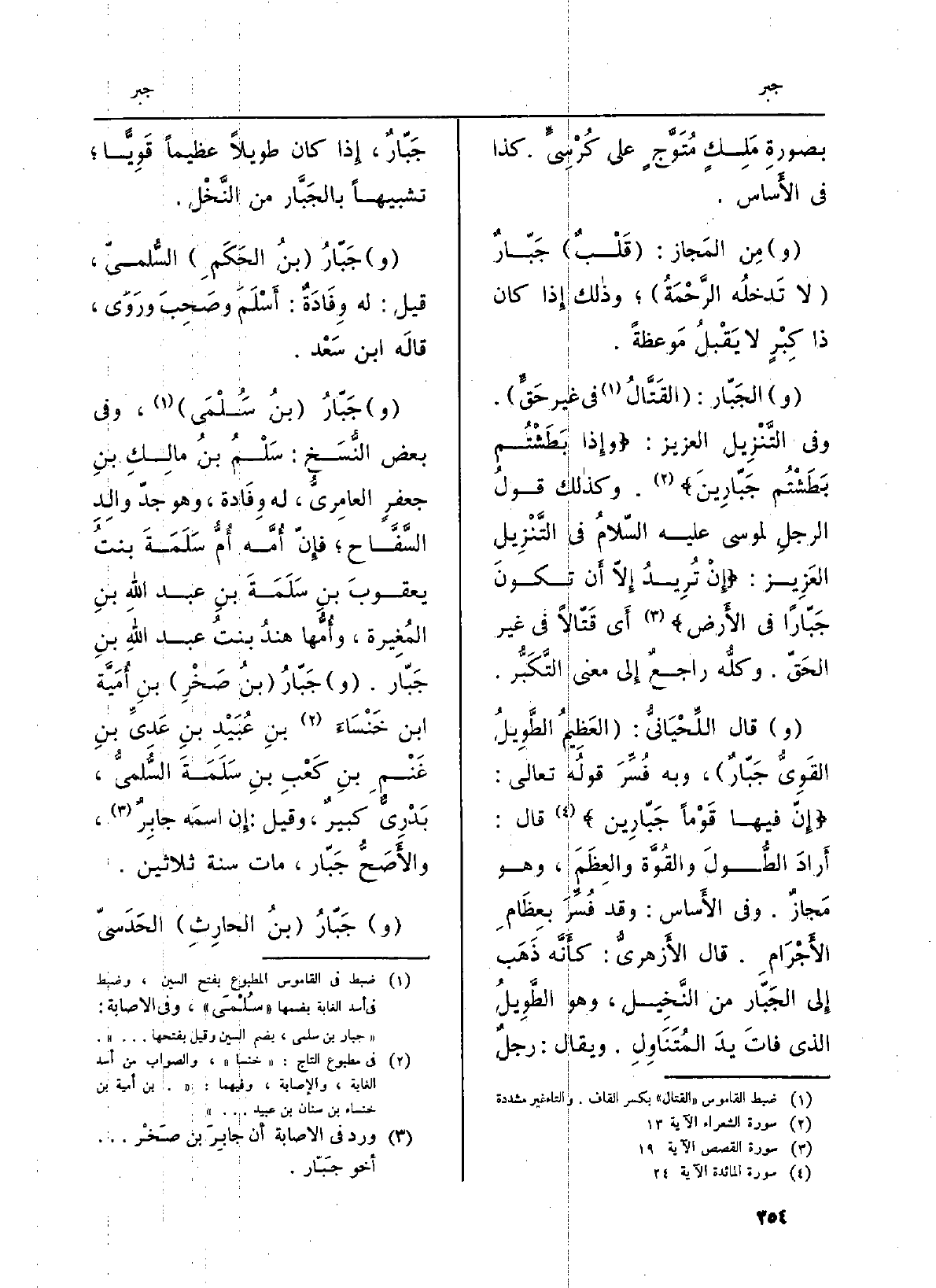 (و) الجَبّار: (القَتَّالُ فِي غير حَقَ) . وَفِي التَّنْزِيل الْعَزِيز: {وَإِذَا بَطَشْتُمْ بَطَشْتُمْ جَبَّارِينَ} . وكذالك قولُ الرجلِ لمُوسَى عَلَيْهِ السّلامُ فِي التَّنْزِيل العَزِيز: {إِن تُرِيدُ إِلاَّ أَن تَكُونَ جَبَّاراً فِى الاْرْضِ} (الْقَصَص: 19) أَي قَتّالاً فِي غير الحَقّ. وكلُّه رجعٌ إِلى معنى التَّكَبُّر.