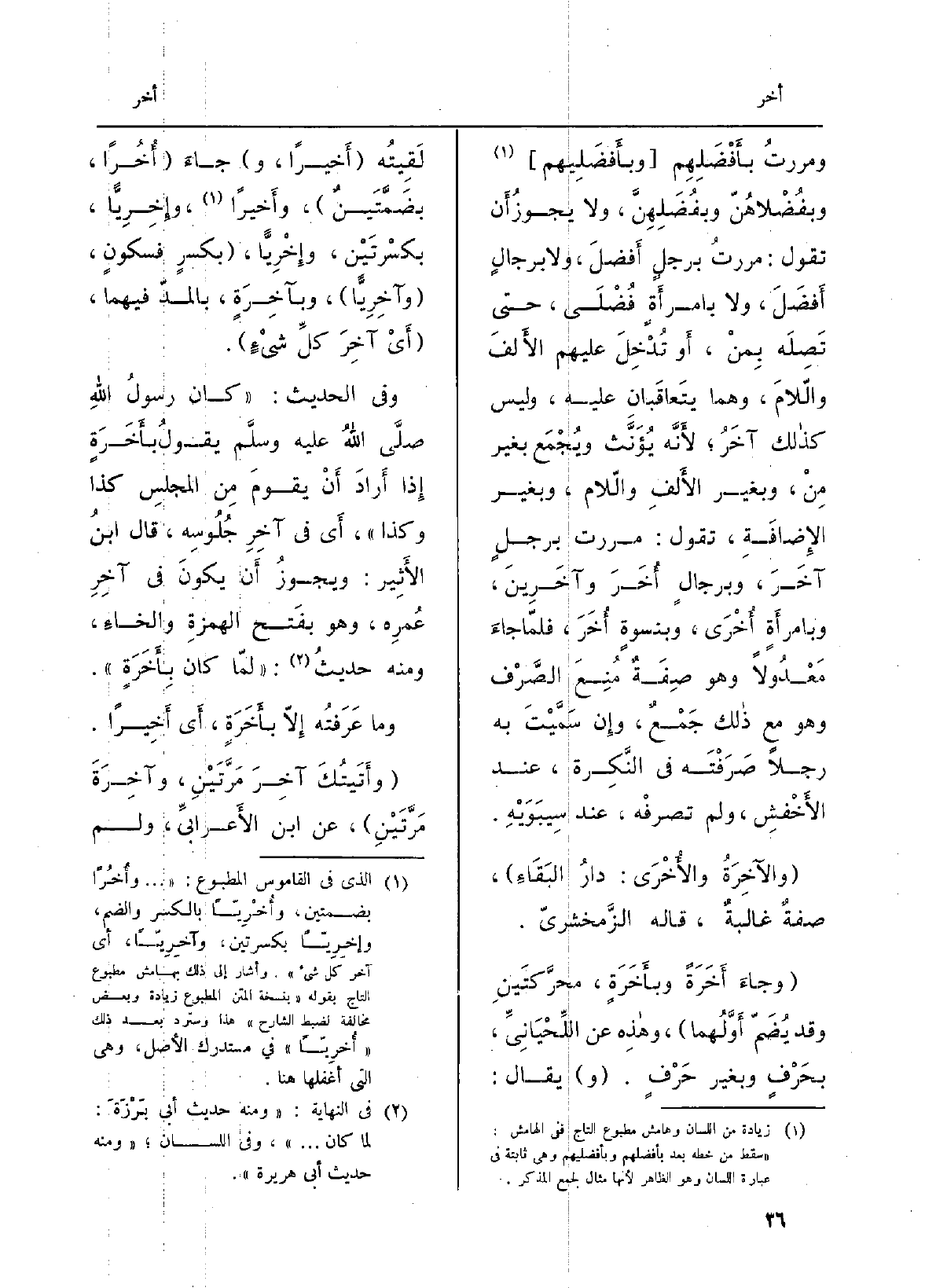 ومررتُ بأَفْضَلِهِم (وبأَفضَلِيهم) وبفُضْلاهُنْ وبفُضَلِهِنَّ، وَلَا يجوزُ أَن تَقول: مررتُ برجلٍ أَفضلَ، وَلَا برجالٍ أَفضَلَ، وَلَا بامرأَة فُضْلَى، حَتَّى تَصِلَه بِمنْ، أَو تُدْخِلَ عَلَيْهِم الأَلفَ والّلَامَ، وهما يتَعاقَبانِ عَلَيْهِ، وَلَيْسَ كذالك {آخَرُ؛ لأَنَّه يُؤَنَّث ويُجْمَع بِغَيْر مِنْ، وَبِغير الأَلفِ والّلام، وَبِغير الإِضافَةِ، تَقول: مَرَرْت برجلٍ} آخَرَ، وبرجالٍ {أُخَرَ} وآخَرِينَ، وبامرأَةٍ {أُخْرَى، وبنسوةٍ أُخَرَ، فلمّا جاءَ مَعْدُولاً وَهُوَ صِفَةٌ مُنِعَ الصَّرْف وَهُوَ مَعَ ذالك جَمعٌ، وإِن سَمَّيْتَ بِهِ رجلا صَرَفْتَه فِي النَّكِرة، عِنْد الأَخْفِش، وَلم تصرفْه، عِنْد سِيبَوَيْهِ.
