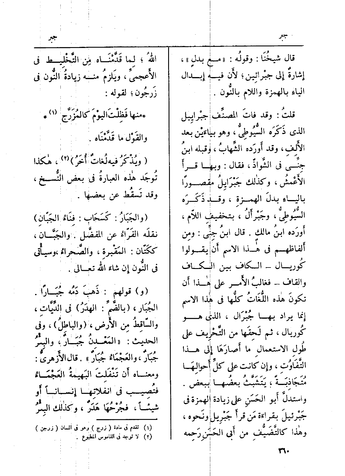 قلتُ: وَقد فاتَ المصنِّف جبْرايِيل الَّذِي ذَكَرَه السُّيُوطِيُّ، وَهُوَ بياءَيْن بعد الأَلِفِ، وَقد أَورَده الشِّهابُ، وَقَبله ابنُ جِنِّي فِي الشَّواذّ، فَقَالَ: وَبهَا قرأَ الأَعْمشُ، وكذالك جَبْرَايِلُ مَقْصُورا بالياءِ بدلَ الهمزةِ، وَقد ذَكَرَه السُّيُوطِيُّ، وجَبْرَأَلُ، بتَخْفِيف اللّام، أَورَده ابنُ مالكٍ. قَالَ ابنُ جِنِّي: ومِن أَلفاظهم فِي هاذا الإِسم أَن يَقُولُوا كُوريال الْكَاف بَين الْكَاف وَالْقَاف فغالبُ الأَمر على هاذا أَن تكونَ هاذه اللُّغَاتُ كلُّها فِي هاذا الإِسم إِنما يُرَاد بهَا جُبْرَال، الَّذِي هُوَ كُوريال، ثمَّ لَحِقَها من التَّحْرِيف على طُولِ الاستعمالِ مَا أَصارَها إِلى هاذا التَّفَاوُتِ، وإِن كَانَت على كلِّ أَحوالِهَا مُتَجَاذِبَةً، يَتَشَبَّثُ بعضُها بِبَعْض. واستدلَّ أَبو الحَسَنِ على زِيَادَة الْهمزَة فِي جَبْرئيلَ بقراءَة مَن قرأَ جَبْرِيل ونَحوه، وهاذا كالتَّضَيُّفِ من أَبي الحَسَنِ رَحِمَه اللهُ؛ لما قَدَّمْنَاه مِن التَّخْلِيط فِي الأَعجميِّ، ويَلزمُ مِنْهُ زيادةُ النُّون فِي زَرجُون؛ لقَوْله: