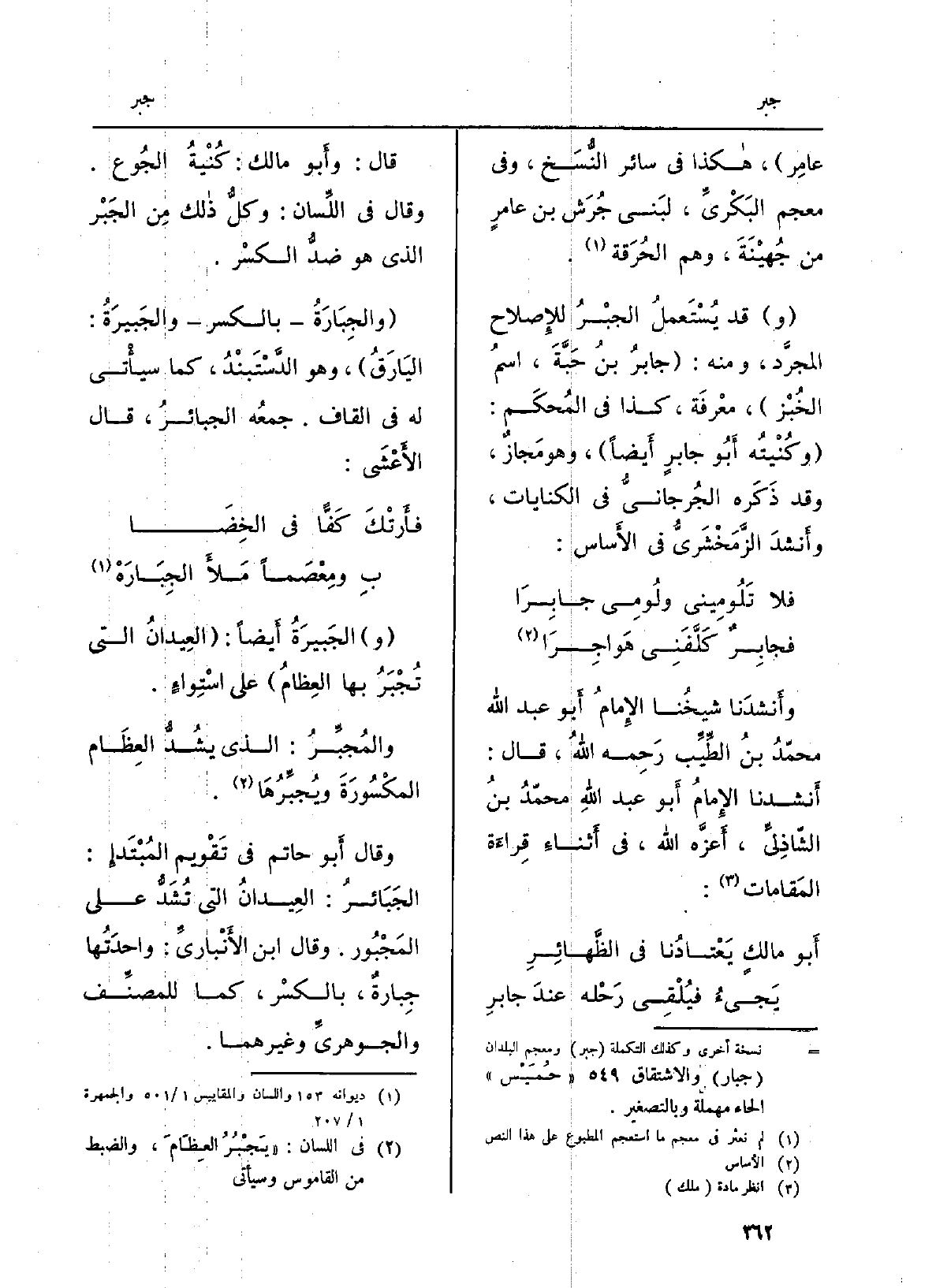 وَقَالَ أَبو حَاتِم فِي تَقْويم المُبْتَدإِ: الجَبَائرُ: العِيدانُ الَّتِي تُشَدُّ على المَجْبُور. وَقَالَ ابْن الأَنْباريِّ: واحدَتُها جِبارةٌ، بالكسْر، كَمَا للمصنِّف والجوهريِّ وَغَيرهمَا.