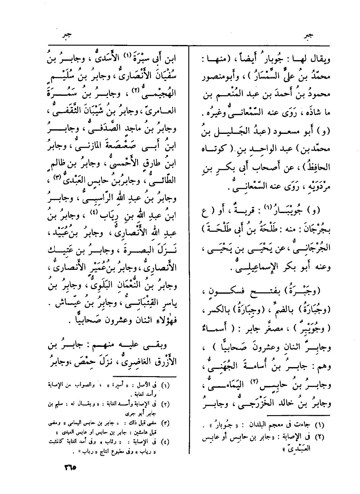 (وجَبْرَةُ) بِفَتْح فسكونٍ، (وجُبَارَةُ) بالضمِّ، (وجِبَارَةُ) بِالْكَسْرِ، (وجُوَيْبِرٌ) ، مصغَّر جَابر: (أَسماءٌ وجابِرٌ إثنانه وعشرونَ صَحابيًّا) ، وهم جابرُ بنُ أُسامةَ الجُهَنِيُّ، وجابرُ بنُ حابِسٍ اليَمَاميُّ، وجابرُ بنُ خَالِد الخَزْرَجيُّ، وجابرُ بن أَبي سبْرَةَ الأَسَديُّ، وجابرُ بنُ سُفْيَانَ الأَنْصَاريُّ، وجابرُ بنُ سُلَيْمٍ الهُجيْميُّ، وجابرُ بنُ سَمُرَةَ العامريّ، وجابرُ بنُ شَيْبَانَ الثَّقَفيُّ، وجابرُ بنُ ماجدٍ الصَّدَفيُّ، وجابرُ بنُ أَبي صَعْصَعةَ المازنيُّ، وجابرُ بنُ طارقٍ الأَحْمسيُّ، وجابرُ بن ظالمٍ الطُّائيُّ، وجابرُ بنُ حابسٍ العَبْديُّ، وجابرُ بنُ عبدِ اللهِ الرّاسِبِيُّ، وجابرُ بنُ عبدِ اللهِ الأَنّصارِيُّ، وجابرُ بنُ عُبَيْد، نَزَلَ البصرةَ، وجابرُ بن عَتِيك الأَنصارِيُّ، وجابرُ بنُ عُمَيْرٍ الأَنصاريُّ، وجابرُ بنُ النُّعْمَانِ البَلَوِيُّ، وجابِرُ بنُ ياسرٍ القِتْبَانِيُّ، وجابِرُ بنُ عيّاش. فهاؤلاءِ إثنان وَعِشْرُونَ صَحابيًّا.