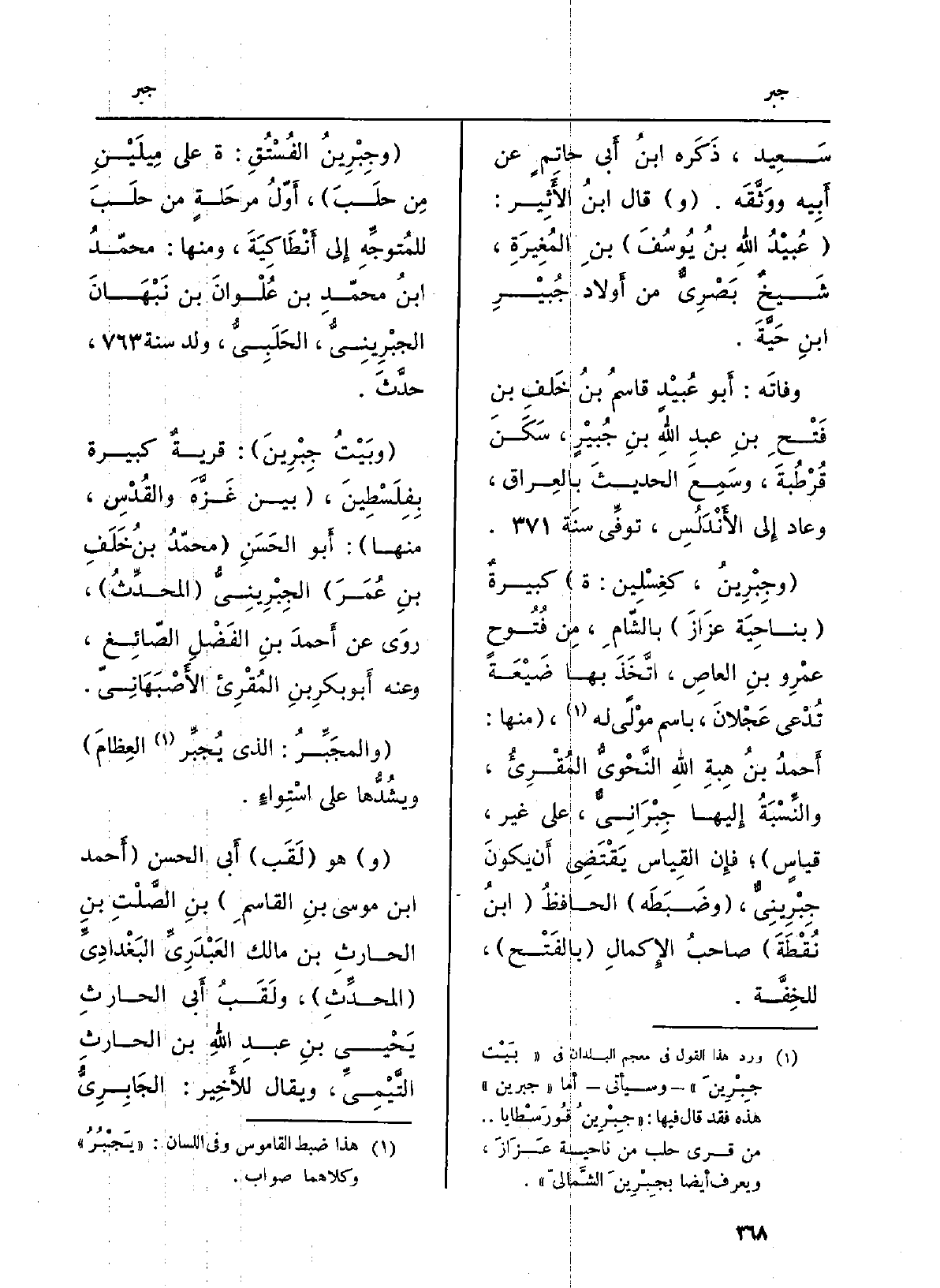 (وجِبْرِينُ، كغِسْلِين: ة) كبيرةٌ (بناحِيَة عَزَازَ) الشّامِ، مِن فُتُوح عَمْرِو بنِ العاصِ، اتَّخَذَ بهَا ضَيْعَةً تُدْعى عَجْلانَ، باسم موْلًى لَهُ، (مِنْهَا: أَحمدُ بنُ هبةِ اللهِ النَّحْويُّ المُقْرِيُّ والنِّسْبَةُ إِليها جِبْرَانِيٌّ، على غير، قياسٍ) ؛ فإِن القِياس يَقْتَضِي أَن يكونَ جِبْرِينِيٌّ، (وضَبَطَه) الحافظُ (ابنُ نُقْطَةَ) صاحبُ الإِكمالِ (بالفَتْح) ، للخِفَّة.