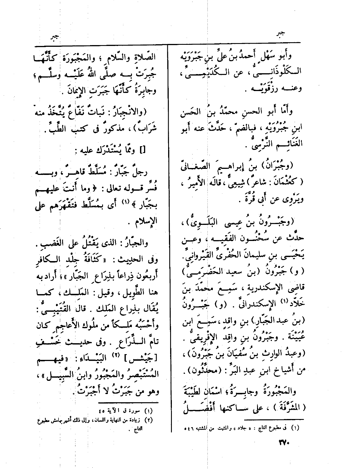 رجلٌ جبّارٌ: مُسَلَّطٌ قاهِرٌ، وَبِه فُسِّر قَوْله تَعَالَى: {وَمَآ أَنتَ عَلَيْهِمْ بِجَبَّارٍ} (قلله: 45) أَي بمُسَلَّط فتَقْهَرَهم على الإِسلام.